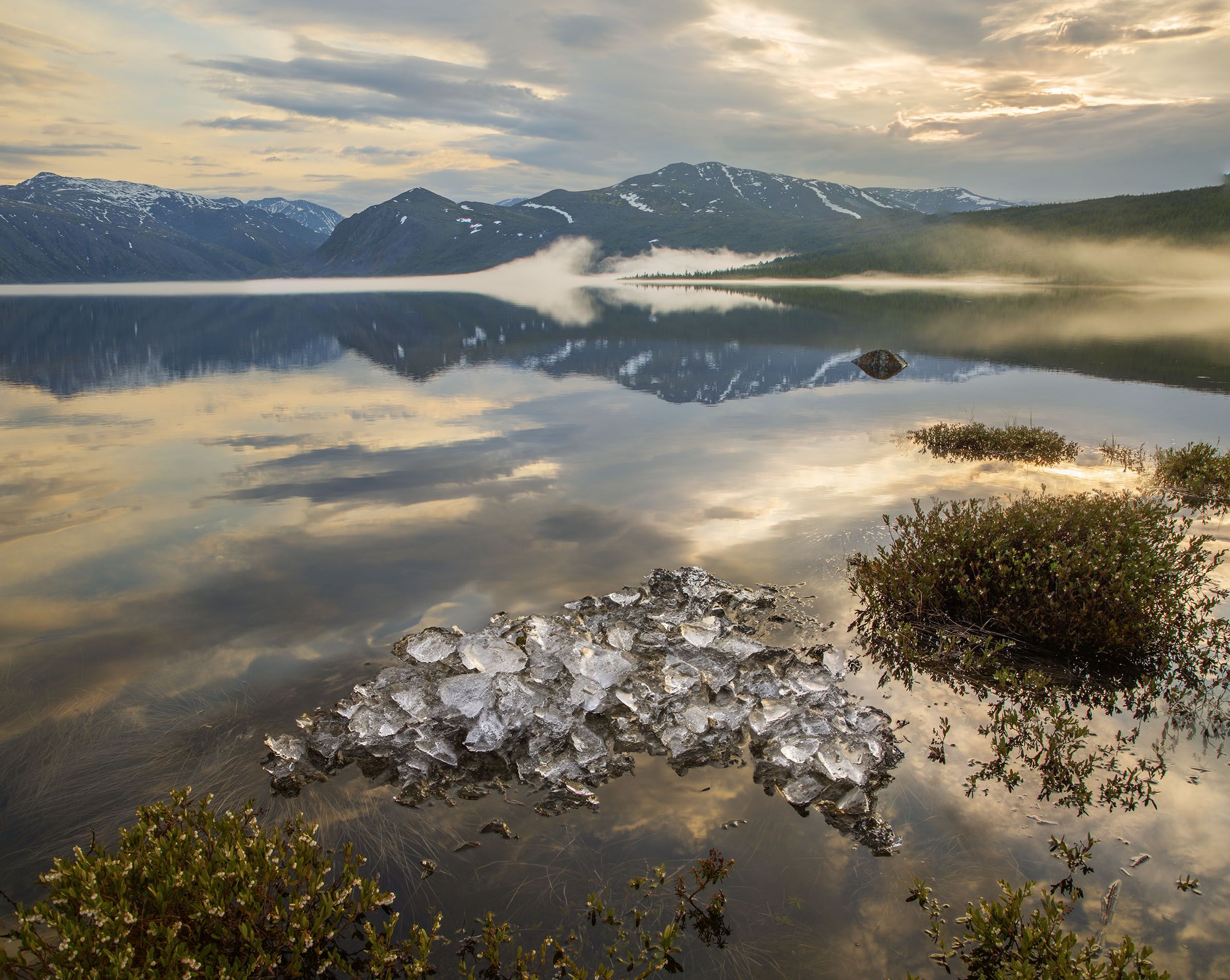 Льды на озере Джека Лондона никак не давали нам отплыть на Косу Биологов. Обычно в июне, в котором я бывал на озере, таких проблем раньше не было. Все дело было в ветрах, которые перемещали льды по озеру. Они то открывали путь, то закрывали и мы потратили почти три дня, чтобы отплыть на Косу Биологов. Три человека остались. Это Юра, у которого были проблемы со спиной, его товарища и друга, который помогал ему, и еще третий товарищ, который не доверял резиновым лодкам. Они поднялись к егерским домикам, и там провели три дня без нас, делая фотосъемки на плато Кудиновских озер. В один из дней еще до отплытия мы плавали на остров Вера, где стоит метеостанция. Теперь работники метео стали не приветливыми из-за обилия туристов. Когда мы плавали, на берегу мы увидели красивые заросли рододендронов. На следующий день мы поплыли туда. Их сфотографировать было не просто, мешали кусты. С воды они смотрелись шикарно, но с берега было сложно их фотографировать, хотя один не плохой снимок я сделал. Слабость из-за отравления цветочной пыльцой рододендронов не давала мне быстро двигаться, и я как лунатик ходил медленно по берегу. В принципе несколько снимков удалось сфотографировать. Один из них перед Вами. Льды таяли настолько быстро, что утром на этом берегу, где мы фотографировали, были торосы из льда, к обеду они растаяли. Я снял остатки ледяного царства. Туманы бродили по озеру. Там, где туман, фотографировали наши ребята. Им казалось, что наш берег полностью покрыт туманом, а нам казалось, что они в тумане. Особенностью туманов является то, что они набирают плотность на длинном расстоянии. То есть они где-то посредине озера. И это иллюзия, что они у противоположного берега.