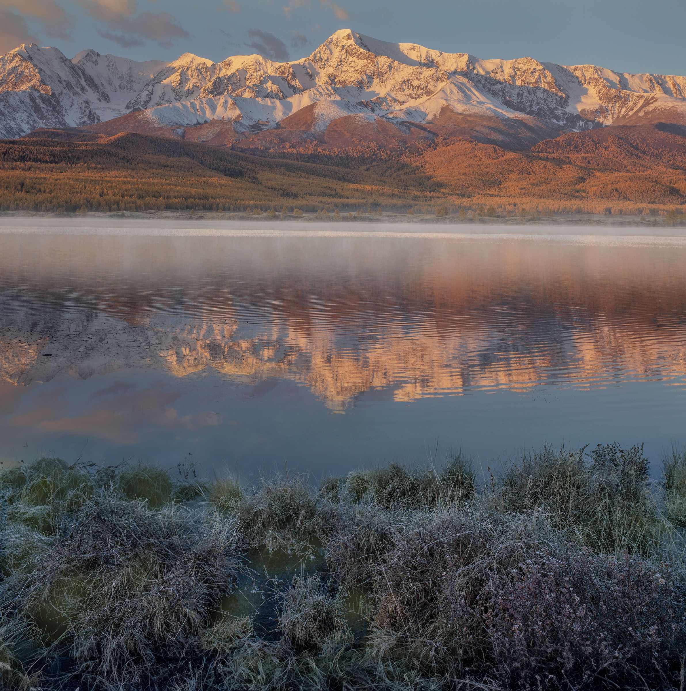 Горы отражаются в зеркальной глади озера , создавая грандиозный вид на Северо-Чуйский хребет, здесь хребет виден во всей красе. Лучшая фотосъемка утром, вечером осенью солнце садится за хребет и он не освещается.