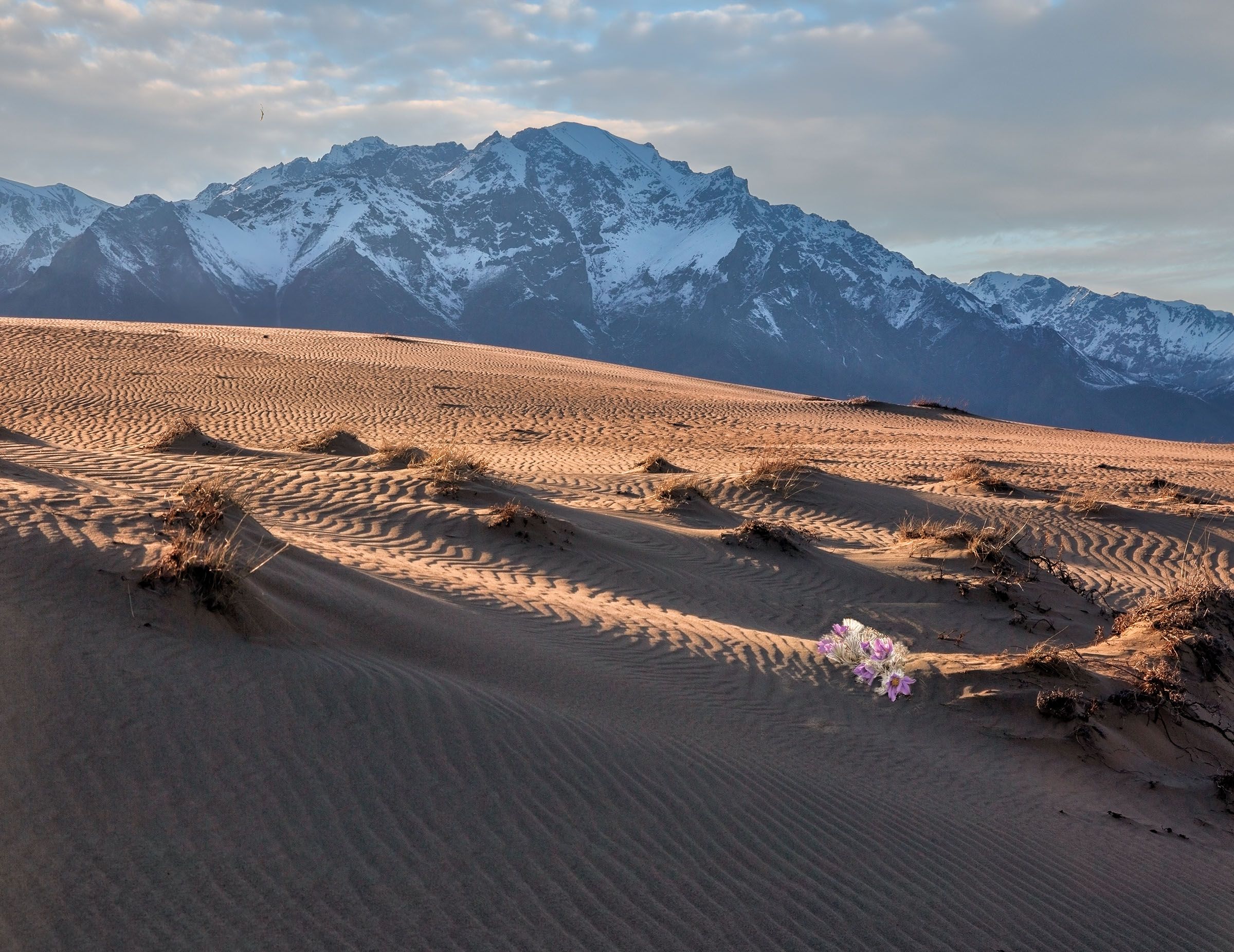 Встречающиеся изредка цветы сон-травы заставляют меня останавливаться и рассматривать это маленькое чудо природы. Сон-трава – один из любимейших мною цветов. Во-первых, за нежный сиреневый с пурпуром цвет и, во-вторых, за совсем нежные волоски на ножках, которые в контровом свете кажутся ажурными. Я фотографирую пейзаж, и он мне кажется картиной в золотой раме. Летом здесь безнаказанная жара, выжигающая всю зелень. Выживают только деревья, которые кажутся дремучим лесом, чьи корни укрыты глубоко под песками. Может и правда, пустыня для того и существует, чтобы люди радовались цветам и деревьям.