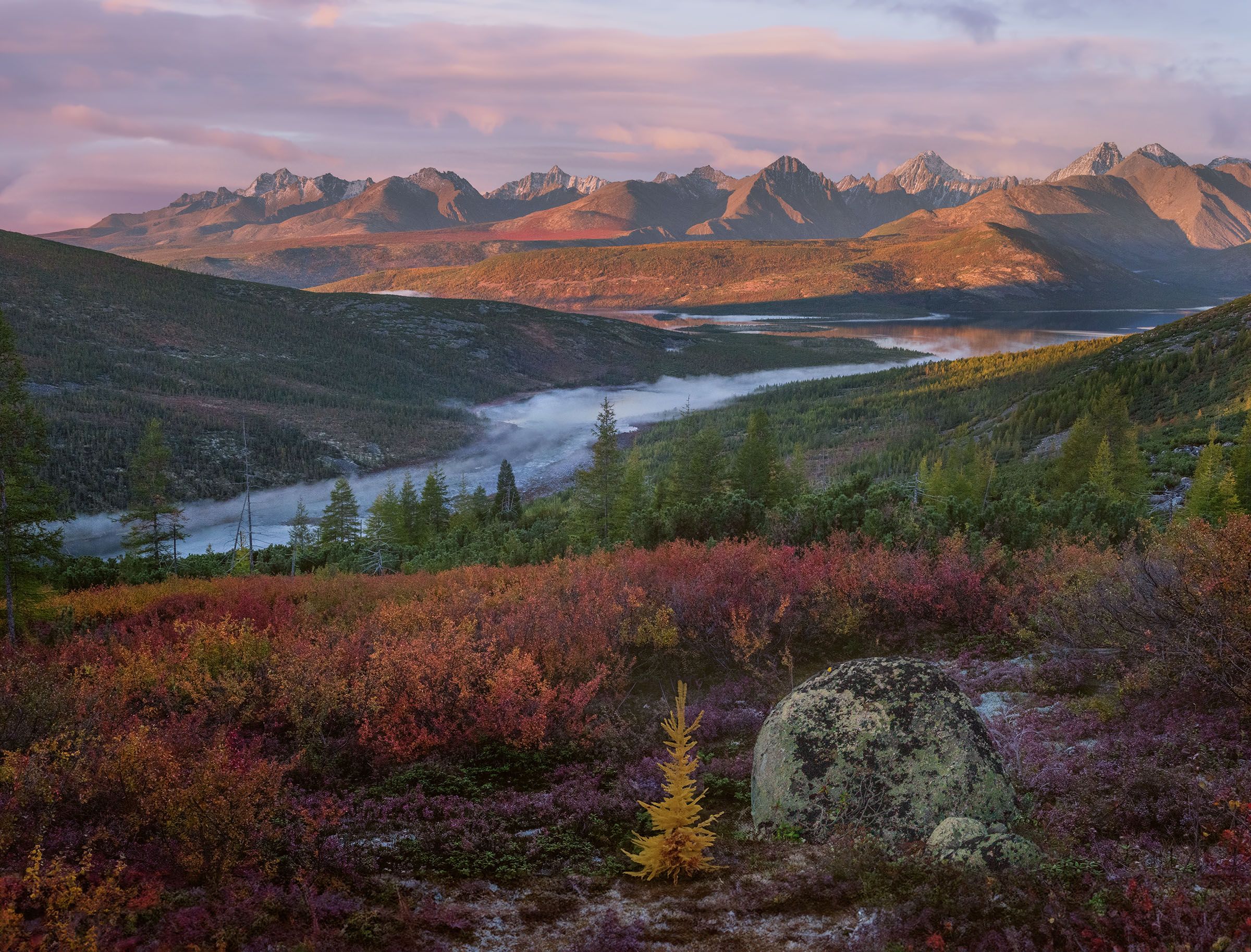 Я снимаю с плато, возвышающегося над озером танцующих Хариусов. Утреннее солнце осветило горы и они сразу приобрели покоряющий вид. Величественность, масштабность и неотразимая красота, царящая вокруг, навсегда останутся в памяти человека, которому посчастливилось хотя бы раз в жизни побывать в этих изумительных местах.