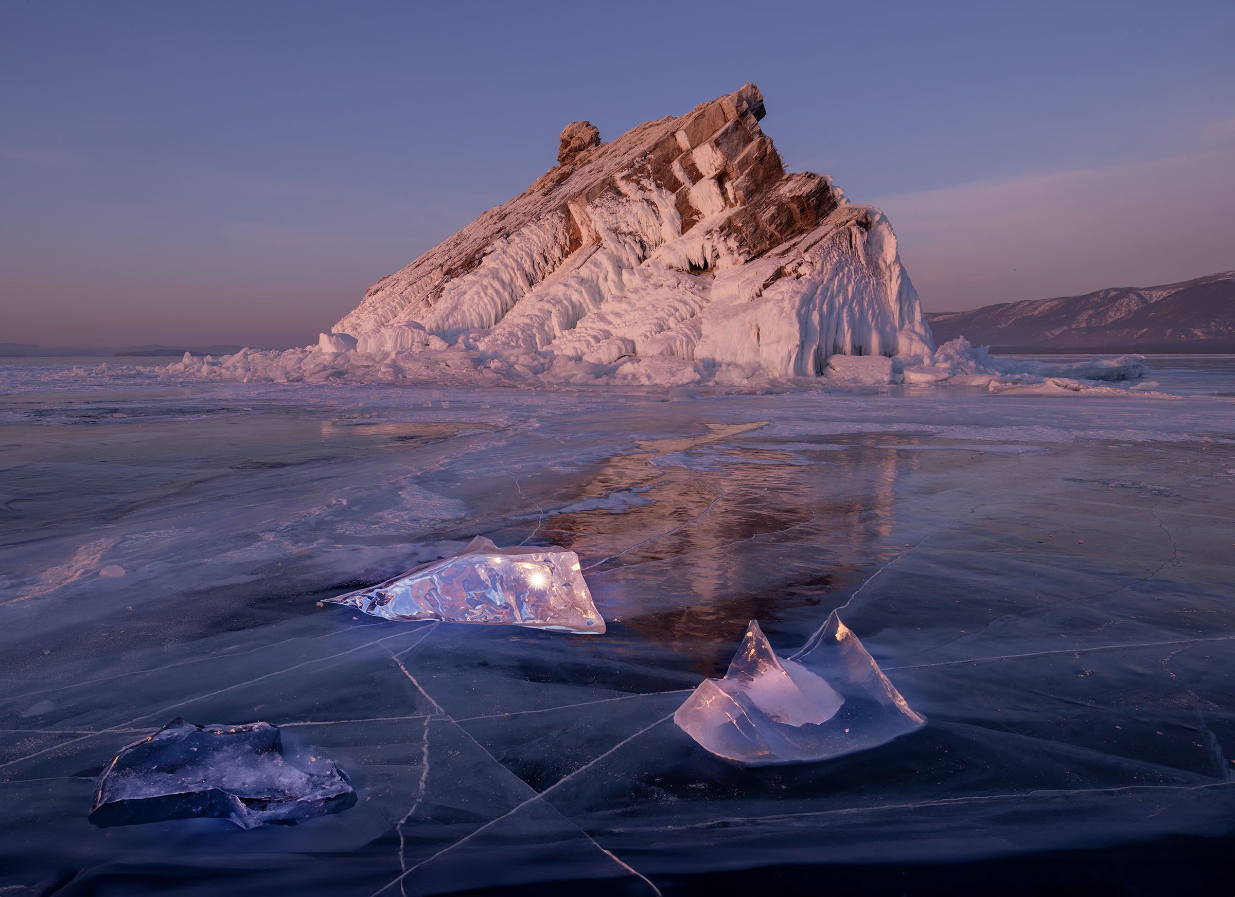 Остров Еленка один из самых симпатичных островов на Байкале. Он небольшой, вытянутый. С торца он кажется пирамидальных, с боков похож на огромного борова, лежащего на льду. В целом он дает высокий выход удачных снимков. Частично из-за своей пирамидальности, частично из-за удачной соразмерности. Он находится от Ольхона у противоположного берега через малое море, напротив Хужира, на расстоянии по прямой около двенадцати километров, хотя кажется, что ближе. Я был около острова несколько раз. В основном на восходе, закате и ночью. Для таких людей, как я нужны фотосъемки, а они по утрам, вечерам, ночью. Мы встаем рано, возвращаемся часам к десяти, иногда к одиннадцати утра. Завтрак, отдых в кровати, или кто как. Обед, и после обеда опять едем. Приезжаем и восемь, и в семь, и в одиннадцать. Но в целом, все время на Байкале на каком-то радостном драйве. Дорога к Еленке объездом, у мыса Шаманки на Ольхоне разлом и часто ледовая обстановка не дает проехать к Еленке. Только один раз ехали к Еленке по прямой линии от пристани в Хужире. Постоянно какие-то разломы, трещины и водители едут сначала на юг, потом поворачивают к тому берегу, там расстояние до берега ближе, трещин меньше, и потом вдоль того берега едут к Еленке. Остров действительно выглядит интересно, что удивительно – со всех сторон, он очень сильно меняется при осмотре его с разных локаций, но всегда фотографичен. Поэтому здесь можно проводить утренние, вечерние и ночные фотосъемки, только крутись возле острова, в зависимости от освещения. Свет сам подскажет, откуда снимать лучше. На снимке розовый рассвет над зимним Байкалом. Розовые с пурпуром наплески на острове поднимаются на небывалую высоту. Можно только представить, какие здесь шторма при замерзании Байкале. Остров открыт всем ветрам, вот они и бушуют возле него при замерзании. А зимой стоит райская тишина. Зимний воздух в центральной Сибири сухой и чисто-прозрачный. Поэтому здесь бывают очень сильные по цвету зори. Сюда приезжают на фотосъемки до двух-трех машин.