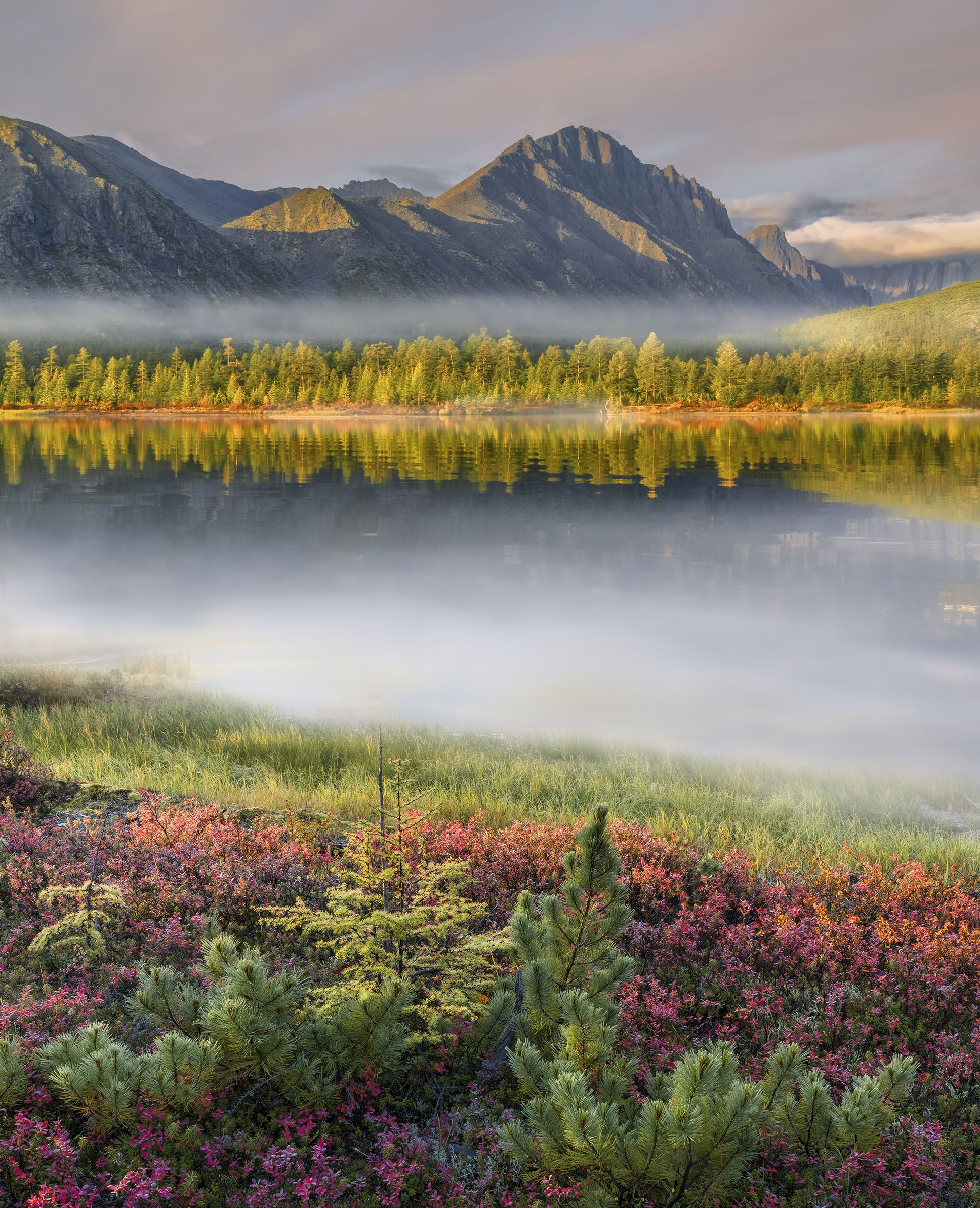 Озеро Невидимка многогранно. Можно фотографировать прямо в устье ручья Неведомый, и там вы сфотографируете редчайшие по очарованности снимки, можно фотографировать от истока ручья Неведомый из озера, можно фотографировать по левому берегу, как идти от истока к устью. Там удивительнейшие по красоте мысы, камни в воде. Много чего. И можно фотографировать с правого берега, как идти от истока к устью. Этот снимок оттуда. Затуманило по поверхности озера, и кроме того потянулся туман над лесом. Теплый утренний цвет типа топленого молока накрыл все вокруг; лес , еще не зажелтевший до настоящей желтизны, принял на себя какие-то необычайные краски. Все застыло в тишине. Пила еле проглядывает от присевших туч на нее. Эти локации мало кто использует, но они хороши. Когда-то, когда я был здесь первый раз, я прошел от Пилы до озера за один день в одиночку и шел этим берегом. Сфотографировал в тот день многое, и он помнится, как один из лучших моих дней.