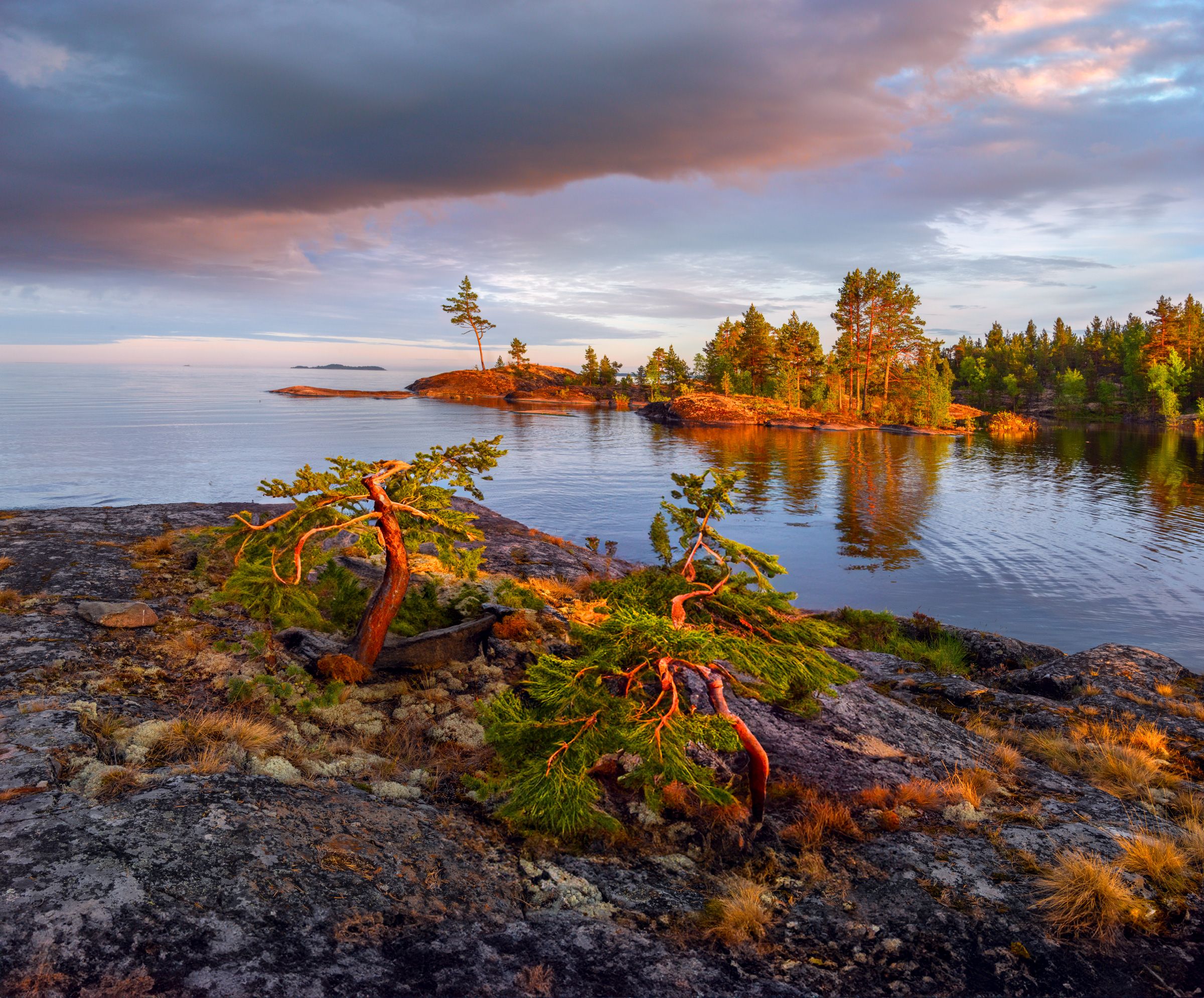 Было тепло и тихо. Мы развели небольшой костер, хотя готовили на газу. Я сидел в раскладном небольшом кресле и глядел на языки пламени. Малоподвижная вода успокаивала меня, никуда не хотелось спешить… Все было хорошо. Я прошелся по выглаженным плоским камням вдоль берега, прикидывая, что и как снимать. На самом мысу росли две кривые изящные небольшие сосны. Уже под вечер я поставил штатив и снял этот снимок. Был десятый час.