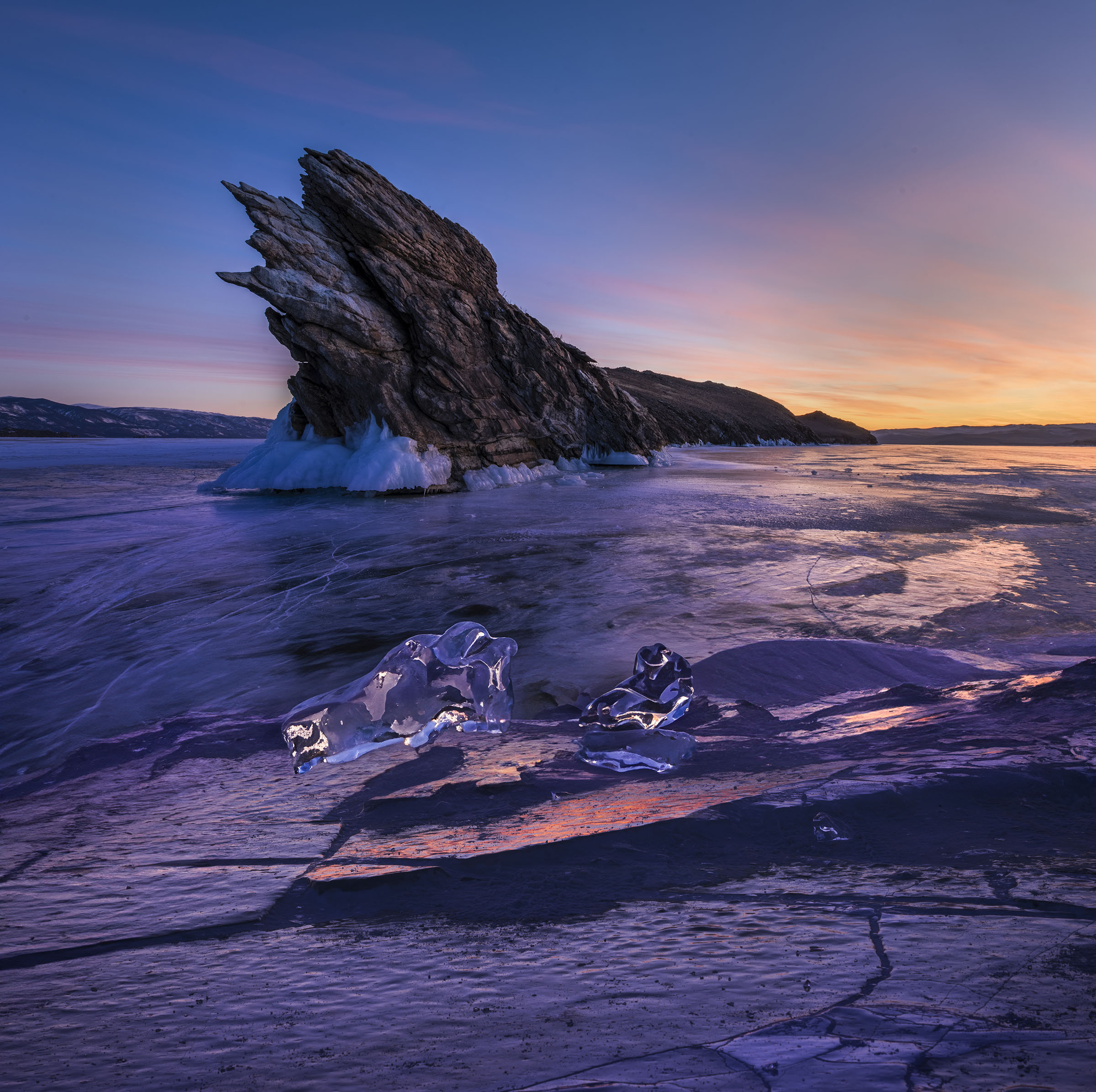 Зимний Байкал удивителен. Несколько островов около хорошо известного и жилого острова Ольхон, имеют особенности в виде острого высокого мысы. Поскольку таких островов несколько – видимо это закономерность образования и формирования скальных островов. Возможно нагрев солнца, течения, ветра и шторма формируют остроконечные высокие мысы. Остров Огой один из таких известнейших и особенных островов. Туризм на Байкал за последние три года сильно изменился. Поднявшиеся цены на услуги транспорта и проживания, но особенно транспорта, из-за этого сократилось количество дней туров и фототуров. Если раньше длительность поездок на Байкал была около недели, причем туры несколько раньше начали сокращать время пребывания на Байкале, то теперь около обычная длительность около трех дней. В основном туры теперь длятся всего три дня. Фототуры тоже три, редко четыре. И появилась еще одна особенность у туров. Раньше хивусы, то есть суда на воздушной подушке, были очень дороги для туристов, то теперь с общим поднятием цен на транспортные услуги, они стали реально вписываться в массовый туризм. На Ольхоне десятка два хивусов. А это сильно изменило локации для туристов, теперь они часто ездят просто на чистый лед, достаточно далеко от островов, скал, гротов. Только лед и небо. Хивус в отличие от уазика может проехать практически везде. Для нас – фототуристов стало легче. Нет такого ажиотажа у гротов.
