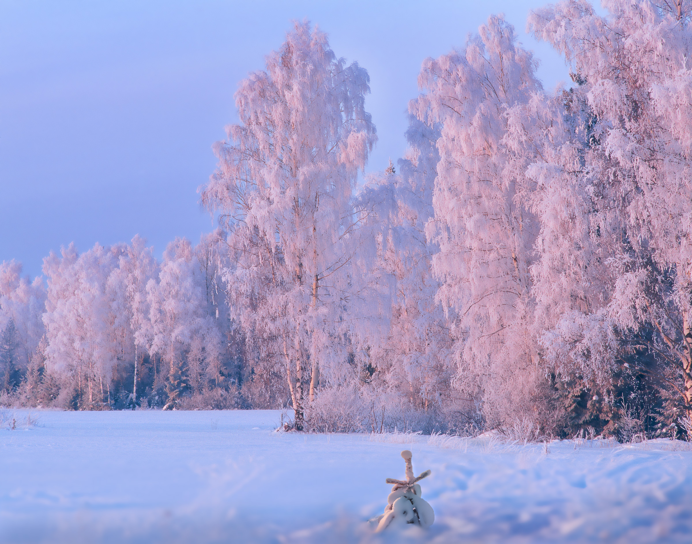 Я вставал затемно. Под окнами спала, укрытая снегом, деревенская улица. Я брал папины охотничьи лыжи — тяжеленные, самодельные — и отправлялся в лес. До соседней деревни я тянул лыжи на веревочке за собой по укатанной зимней дороге, и уже поднявшись на самый верх за деревней, одевал на валенки лыжи, и шел безмолвным полем к лесу. Вставало солнце и все сразу преображалось. Лес загорался нежными розовыми огнями. Куда ни кинь взгляд — поля и леса — всё пылало. Пылало пунцовым, малиновым, коралловым, лучезарным. В тенях, где царила прохлада, ветви деревьев отливали тончайшей синью, будто впитали сам цвет утреннего неба с его темной, бархатной глубиной.