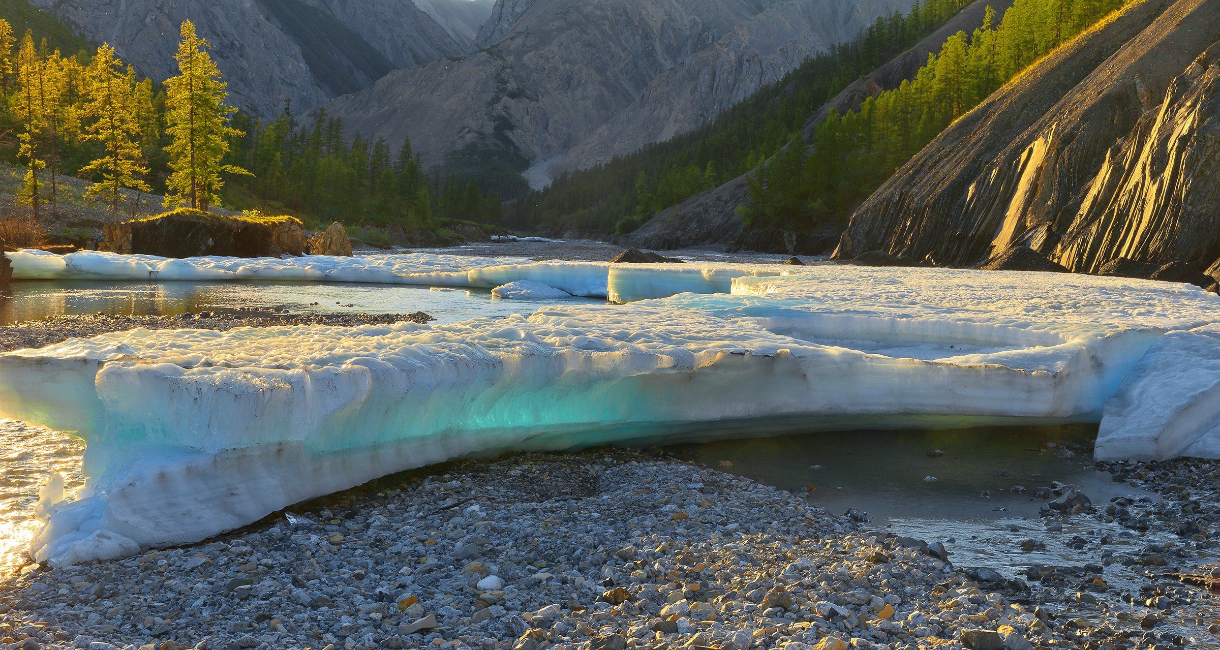 Наледь на реке Казбек, притоке Омулевки. Омулевка здесь только еще вошла в каньон хребта Омулевкого поднятия, являющего частью гор Черского, или как еще говорят - хребта Черского. Ущелье реки Казбек узкое и в июне сохраняется еще достаточно много массивных наледей, которые в это время интенсивно тают. Вечерние лучи осветили наледь так, что падают на боковую стену наледи и просвечивают насквозь.