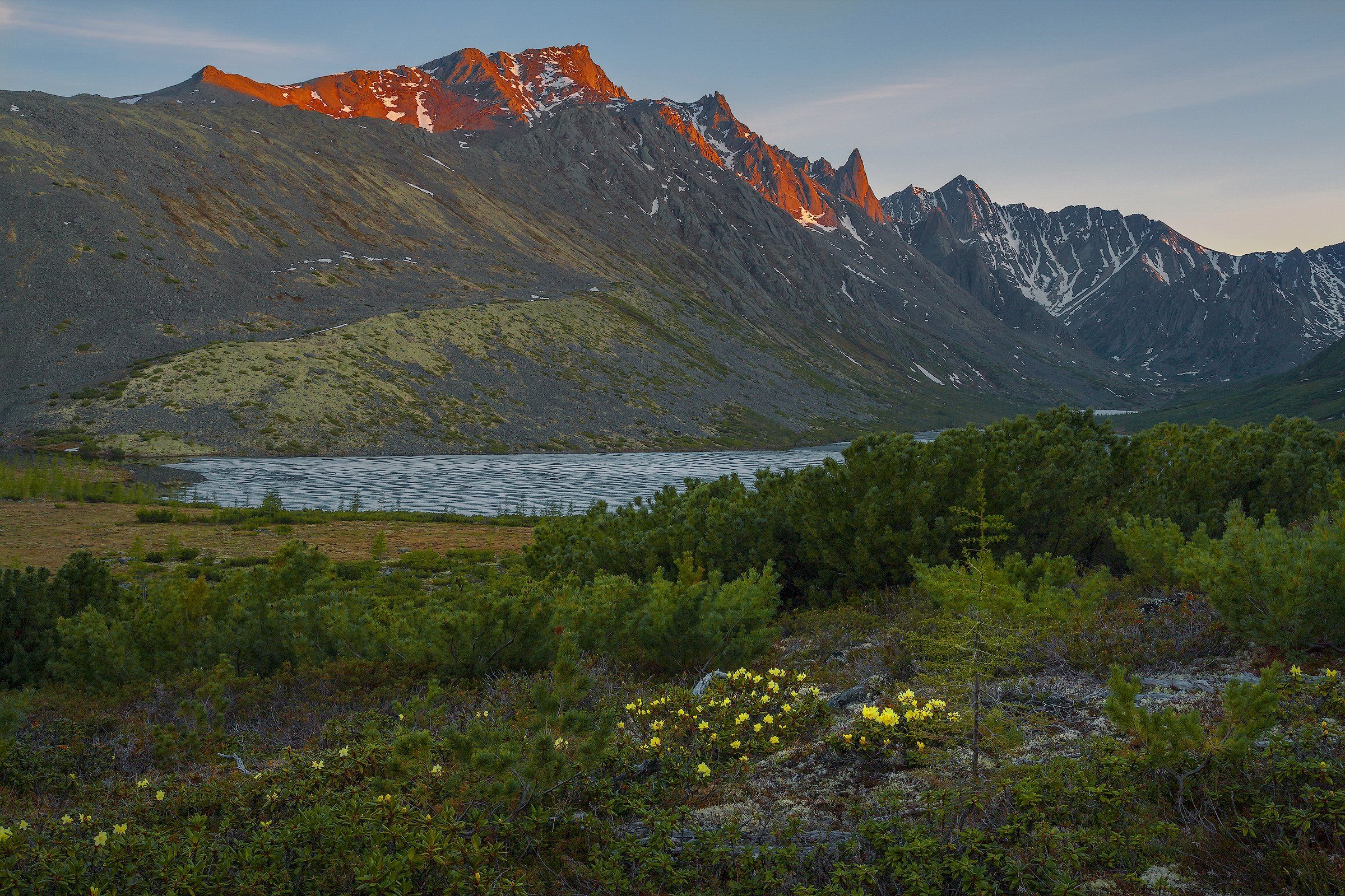 Рядом с озером Джека Лондона находится ручей Сибик-Тызллэх. На нем расположено несколько озер, которые начинают таять в июне. Вдали, в лучах заката виден остроконечный пик Челленджер. На переднем плане рододендроны.