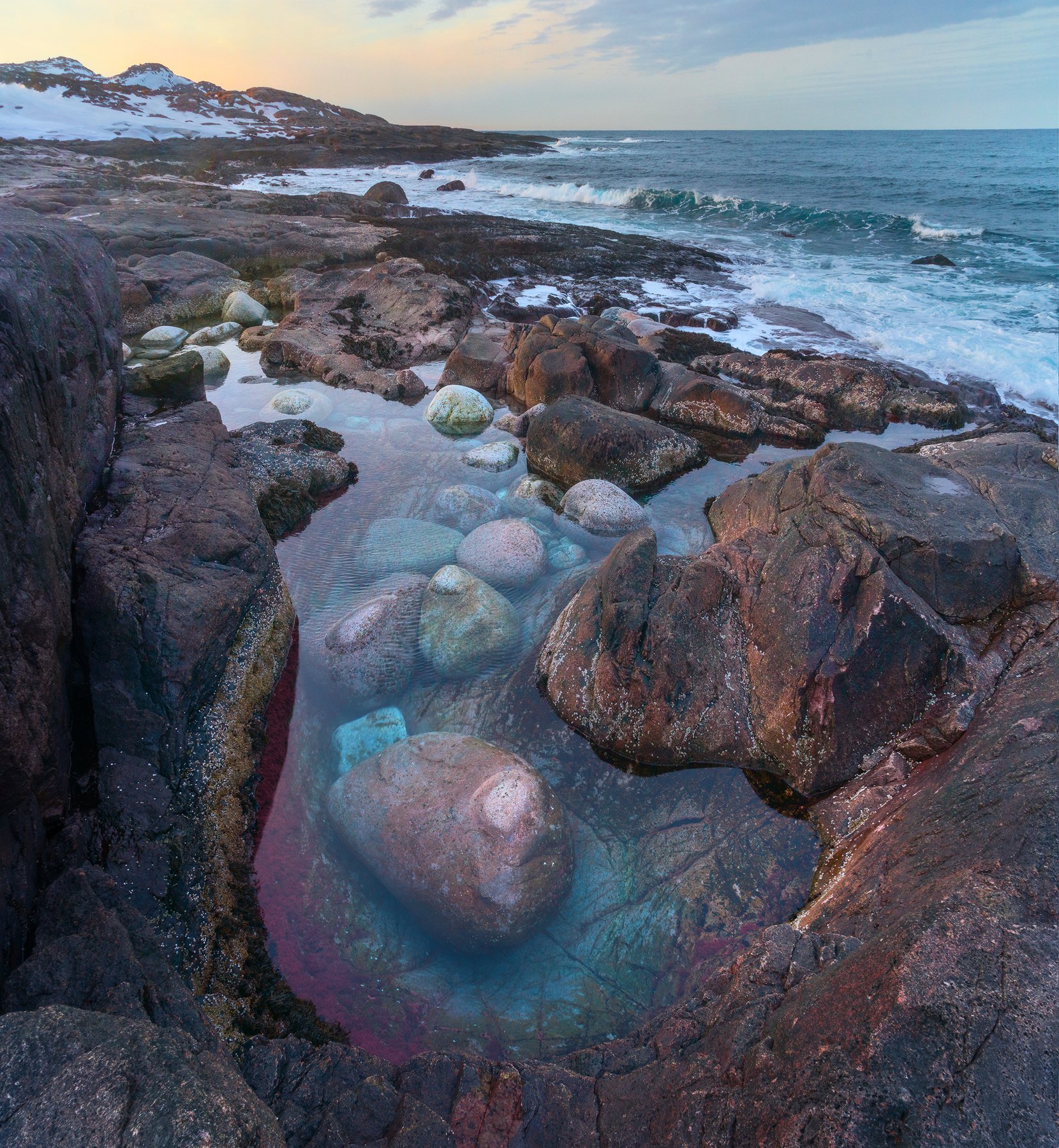 Время и волны сделали очень выразительные ямы, заполненные морской водой и округлыми камнями. В этих ямах живут пурпурные водоросли, контрастирующие с голубоватой водой.
