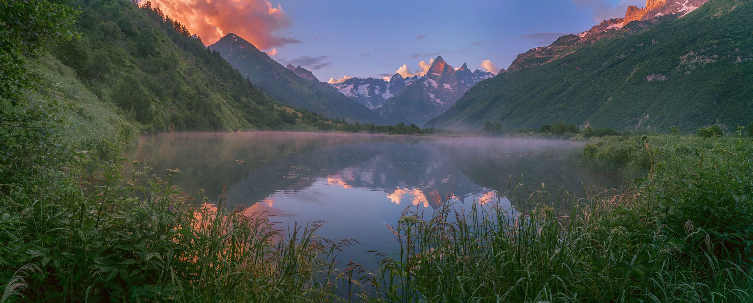 Я был в июле три раза на озере " Тысячи туманов" и все три раза озеро туманило, то больше, то меньше. Немного менялся цвет от голубоватого до сиреневого. Жаль, конечно, что прямой солнечный свет не достигает утреннее солнце, оно появляется из-за гор на излете утра, над озером еще немного стелются остатки тумана, но и он скоро исчезнет под солнечными жаркими лучами. Но сейчас еще раннее утро и туман, то густеет, клубясь над озером и широкой долиной реки Гоначхир, то почти исчезает. Здесь рядом с озером проходит дорога на перевал, ведущий в Абхазию, но приблизительно через километр отсюда стоят пограничники и они пропустят только с погранпропуском, который надо заранее получить. И это территория Тебердинского заповедника, то есть надо также получить разрешение заповедника для того, чтобы находиться на территории заповедника. Но я научился получать и то и это. Рассчитываю на следующий год фотографировать почти с перевала. Границу пересекать нельзя. Но с верхних точек откроются изумительные виды с озерами и цветущими полями рододендронов. Приглашаю всех со мной в фото тур по Кавказу в июле: " Вдоль Главного Кавказского Хребта". Информацию можно посмотреть на сайте http://ryabkov-photo.ru/ в разделе phototours.