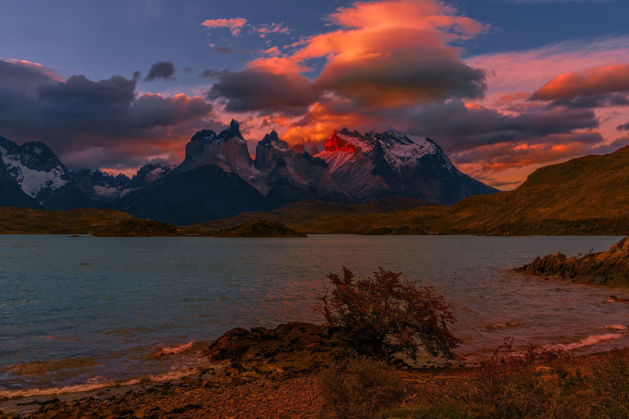 Вечер на озере Пеое в национальном парке Торрес дель Пайне, расположенном в Чили. Это первый вечер, как мы здесь появились. Недалеко от наших палаток был скалистый берег, где многие фотографы меряются умением в мастерстве фотосъемок знаменитейших гор. С первого раза трудно найти подходящие точки съемки и я бегал по берегу их выискивая. Кое-что мне нравилось, кое-что нет. Именитый скальный берег, расположенный наиболее удобно и близко с первого раза мне не показался чем-то особенным и прошел дальше по берегу. Уже начало темнеть и начал разгораться закат, который я сфотографировал с разными передними планами и разными облаками, которые менялись очень быстро и с разным светом. Солнце садилось и наилучшие краски были где-то в средине заката...