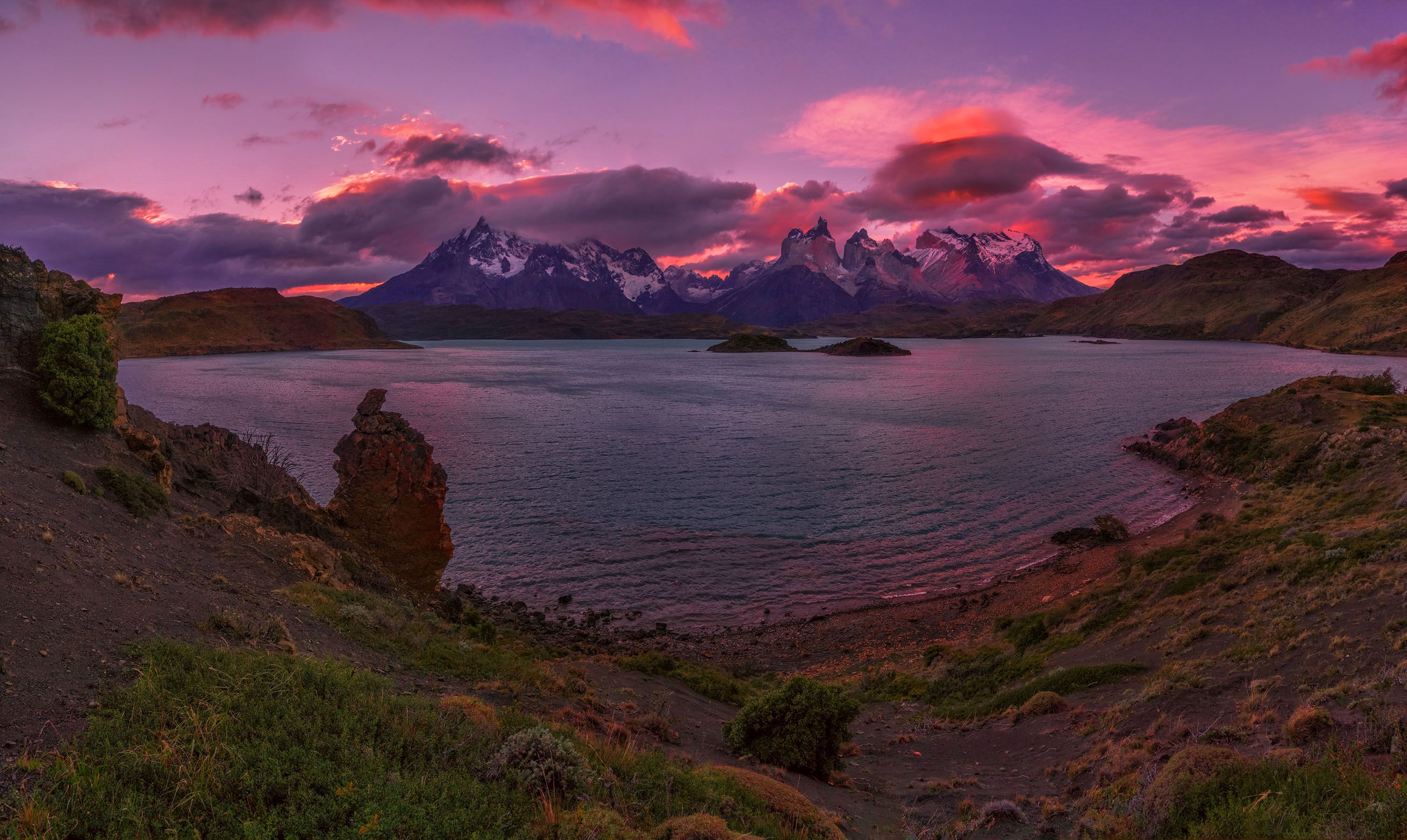 Патагония. Чили. Торрес дель Пайне. Это место одно из самых фотографируемых на озере Пеое. Точней, с этого места, а еще точней немного вправо, и там есть скалы и оттуда фотографы часто фотографируют. Я прошелся вдоль берега и решил сфотографировать панораму. Когда нет ближнего переднего плана я снимаю панорамы вертикальными кадрами в один ряд. Как в этом случае, а если есть близкий передний план, то снимаю горизонтальными снимками в два ряда. Верхний ряд - навожу на резкость по дальнему плану или среднему, нижний ряд по ближнему переднему плану. Так называемый фокус стекинг. Вообще на озере Пеое горы освещаются утром, вечером же только боковые склоны. Поэтому вечером сложней снять вечернюю зорю, особенно, если небо ясное. Во время этой фотосъемки образовалось красивое лентикулярное облако на Куэрносами и все выглядело интересно...