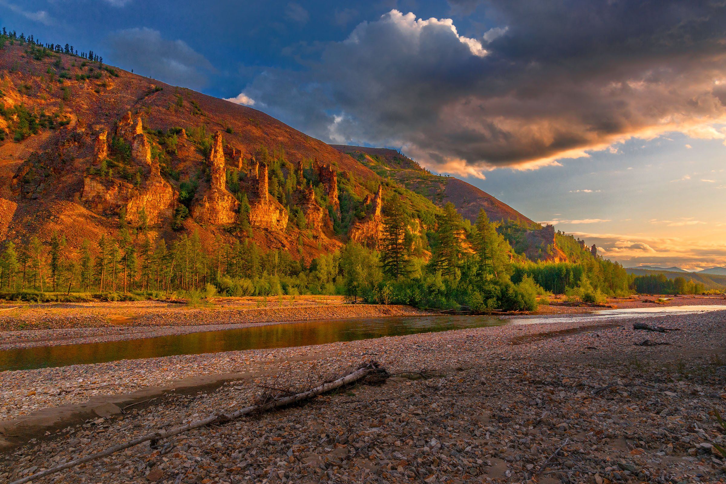 Река Хета находится на Колыме, от Магадана километрах в двухстах с гаком. На ней есть два интересных места, где стоит фотографировать. Лето на Колыме сказочное. Тепло, как правило, теплей чем в Москве. Это зима здесь зверская, а лето настоящее чудо, Правда, числа с 12 июня появляются комары в большом количестве, но при современных спреях это уже не так страшно. Числа с 15 июля число комаров резко падает. Эта фотография выполнена 14 июля. Комаров было уже мало. Когда их много, я машу веточкой перед камерой, разгоняя их. Все время, проведенное на этих столбах, прошло в каком-то домашнем уюте. Мы не уставали, ходить было не далеко. Оставалось только найти сюжеты и определить точки съемки. Всегда, когда я гляжу на колымское небо, мне хочется взмыть вверх и увидеть, что там вдали. Но взмыть не высоко, не теряя ощущения данного места. Я часто летал в Магадан и обратно и когда я летел из Магадана, ну может около ста полетов, и каждый раз, когда самолет поднимался очень высоко, мне не хватало рядом этих гор и просторов над ними. Получается есть какой-то высотный потолок, выше которого подъем неинтересен. У меня такое было и с парапланами. Я много летал. Чем выше, тем хуже, чем ниже, тем лучше. Глядя на этот снимок, мне хочется полететь в голубую даль на высоте небольших пташек... И все рассматривать вокруг.