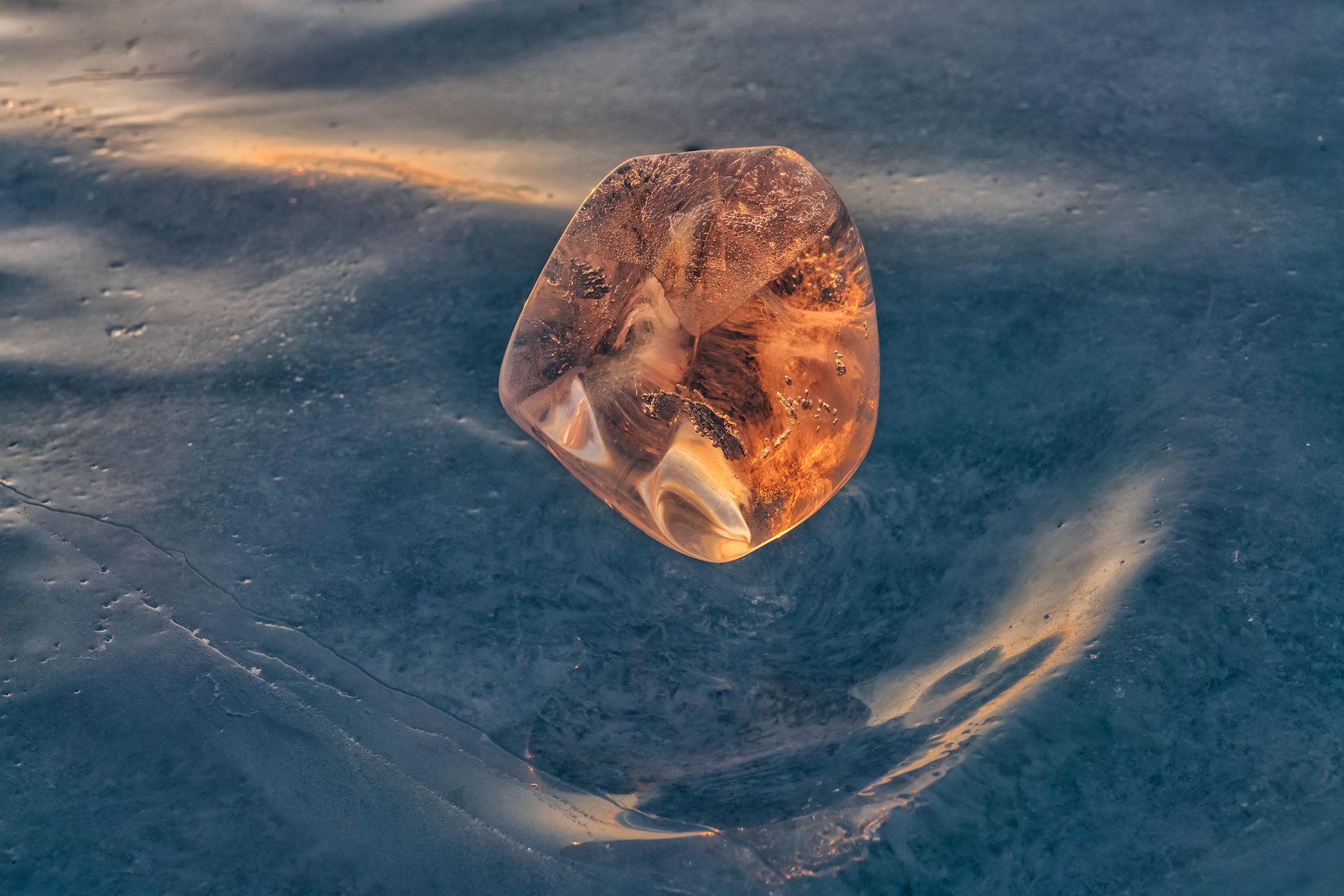 Этот ледяной кристалл настолько чист и прозрачен, что начинает играть отражениями граней. Он больше похож на огромный алмаз, переливающийся и искрящийся чистыми и теплыми цветами радуги. Перед ним вытаявшая лунка. Нас было семь человек и все, кроме Кен, лежали на льду и искали свои дедяные алмазы. Солнце стремительео всходило и хотелось снять разнообразные огромные алмазные фигуры из чистейшего льда.
