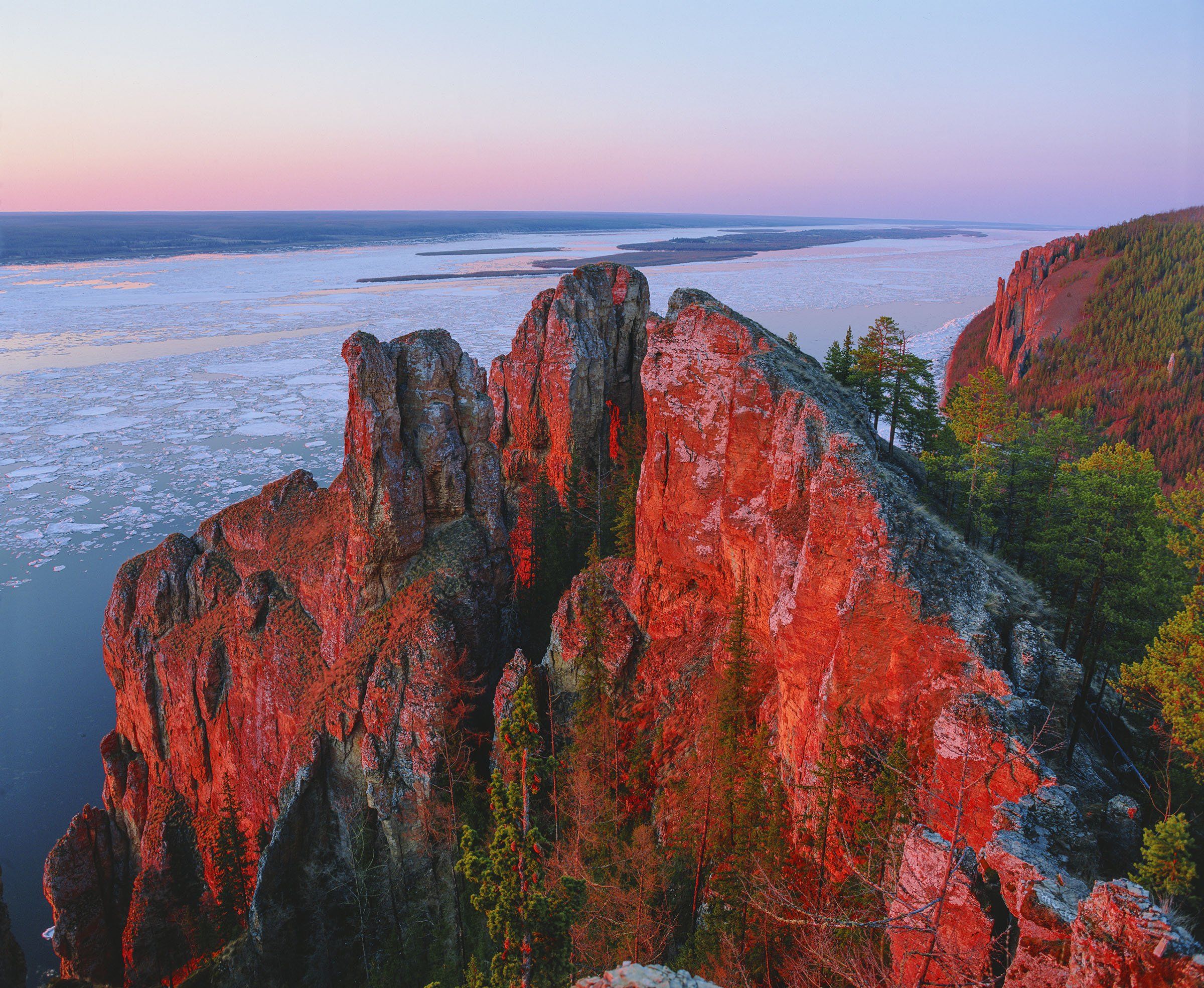Я был на Ленских столбах три раза. Первый раз в феврале. Когда я приехал в Покровск, где находится офис природного парка Ленские столбы, то оказалось, я был первый фотограф, который приехал зимой. Иногда пишут, что они где-то были зимой в марте, но все-таки это весна. В марте даже в Оймяконском районе днем теплеет, хотя ночью может быть около пятидесяти. Но днем-то выше сорока, это уже весна. В феврале в Якутии днем такая же холодина, как и ночью. Потом я был на столбах летом, а потом весной, начиная с 9 мая. Мы перебрались на лошадях на тот берег, где столбы. Без лошадей не получилось бы, так как перед берегом лед метров на пятнадцать был под водой, которая быстро летела вниз по реке. Глубина была такой, что я сидя на лошади доставал ногами воду. Без лошадей поток воды просто снес бы нас. Мы каждый день со студентом Сашей из Якутска, моим помощником ходили далеко, то вниз по Лене, то вверх по реке, то поднимались на горы. Каждый день воды прибавлялось. Однажды мы протащили по льду лодку дюральку вниз километра три. Когда мы закончили фотосъемки к вечеру и вернулись к лодке, которую мы предварительно вытащили на берег, то увидели огромные торосы высотой метров пять, которые придавили лодку к скале. Произошла подвижка льда. Хорошо, что лодку вытащили высоко на берег, к самой скале, иначе бы не смогли вернуться назад, нам надо было перед домиками на Ленских Столбах переплыть бушующий приток Лены - реку Лабыдя, за ней стояли домики. Мы вставали рано, около полтретьего. Уже было светло и горел рассвет. Несколько раз происходили подвижки льда. Мы вставали так, чтобы успеть подняться вверх на скалы, а туда надо подниматься около 20-30 минут, на самый рассвет. Чтоб встать со штативом хотя бы за пять минут до появления солнца над горизонтом. Однажды мы проснулись и я вышел из домика - река тронулась. Сплошным месивом шел лед. Прямо с берега я снял в восходных лучах это крошево и месиво вращающихся и крутящихся белых и синих льдин. Вечером мы вылезли на смотровую площадку и я сфотографировал этот вид с ледоходом. Вечернее солнце выкрасило скалы Ленских столбов в малиновые тона. Наверху стояла мертвая тишина, ни ветерка, ни дуновения, только свежий, почти морозный воздух щипал ноздри, немного пахло хвоей и теплыми скалами.