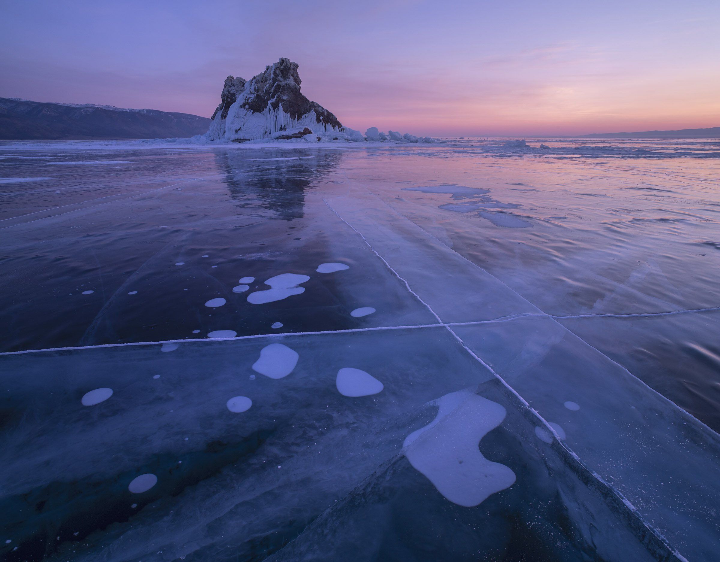 Мы приехали на остров Еленка еще ночью. Долго фотографировали ночные снимки. Уже под утро я залез в уазик и вздремнул с часик. Мои подопечные из Гонконга все еще возились со звездами на уже начавшем блекнуть ночном небе. Начинался рассвет. Я опять выбрался из уазика и порекомендовав всем обойти остров со всех сторон, чтобы выбрать лучшие точки съемки. Дав первый круг я вернулся в исходную точку. Друзья прилипли ко льду в одном месте, подойдя я увидел причину - белые воздушные пузыри они использовали в качестве переднего плана. Я тоже присоединился к ним. Снимок состоит из двух горизонтальных снимков, которые я сшил в фотошопе. Рассвет продолжал разгораться...