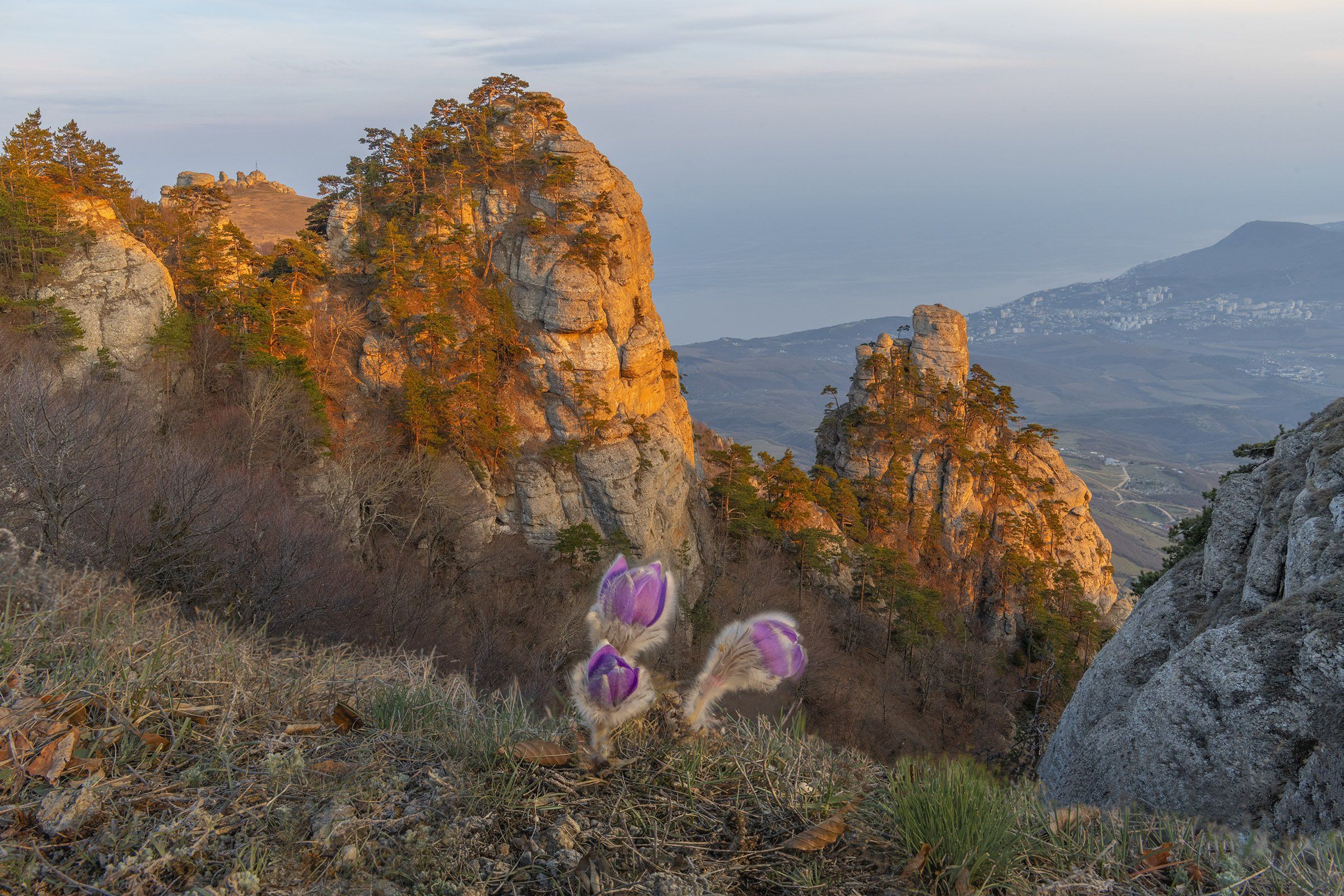 Когда я снимал мимо нас прошла группа фототуристов, они что-то фотографировали, а я так и лежал на земле, снимая этот чудесный нежный плод Демерджи. Я заранее прошелся по этим местам и нашел несколько цветов, растущих в нужном месте и было жалко, что я смогу сфотографировать только один. На следующий день тоже только один. Режимное время неумолимо и очень кратко. Всего десять-пятнадцать минут. Но я не жалею, что снял в этот вечер, только эту сон-траву. В душе все пело. Мешала только Алушта, внося некоторую дисгармонию в снимок.