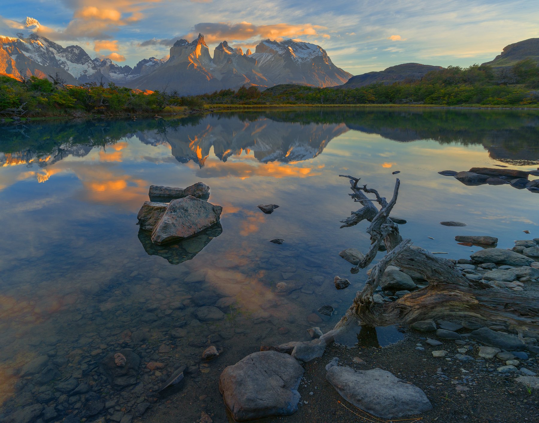 Патагония!... Какое сказочное слово. С детства я слышал о ней у Жюль Верна в романе "Дети капитана Гранта". И хотя Жюль Верн жил на корабле и даже путешествовал, он никогда не бывал в Патагонии, которую описал в фантастических представлениях. В реальности она не имеет ничего общего с тем, о чем я читал и представлял. Она еще до сих пор дикая. Этот снимок сделан в Чили на озере Пеое. Рядом Аргентина. Так даже граница не определена между странами. Все здесь в естественном состоянии. Но может, кроме этого озера и других озер, которые стоят от гор подальше. Здесь национальный парк. Какое-то время назад его сожег турист, то ли закуривший, то ли разведший огонь. Теперь здесь строго. Нельзя даже сходить с троп. Могут поймать рейнджеры и выдворить с территории парка. У меня осталось самое теплое чувство к Патагонии. Например, я был в Италии в Тоскане, но такого чувства не осталось. Наоборот. Больше никогда не поеду туда, по крайней мере, на фотосъемки пейзажей. Например русская природа тоже связана с деятельностью человека. Мы снимаем пейзажи в средней полосе часто в поле, лесных опушках, вдоль рек. Но у нас еще соблюден баланс между антропогенным влиянием на природу и девственностью. Даже в подмосковье можно сфотографировать настоящие пейзажи. А в Тоскане нельзя. Только антропоген. А про Патагонию и говорить нечего. Та же Сибирь. Так бы и уехал на пару лет туда, но это не реально по многимипричинам, и даже не денежным. Хотя на пару лет денег надо много. Если и поеду в Патагонию, а я собираюсь туда, то на пару месяцев: с конца весны до начала лета. Числа с пятнадцатого октября по 15 января. Сначала Патагония шокирует своим лесом, он настолько не похож на наш. Ну, совсем не похож!... Леса Патагонии совсем не похожи на наши. Все крученое, перекрученное, не пролезешь. Правда, потом они начинают тянуть к себе. Ранее утро на озере...