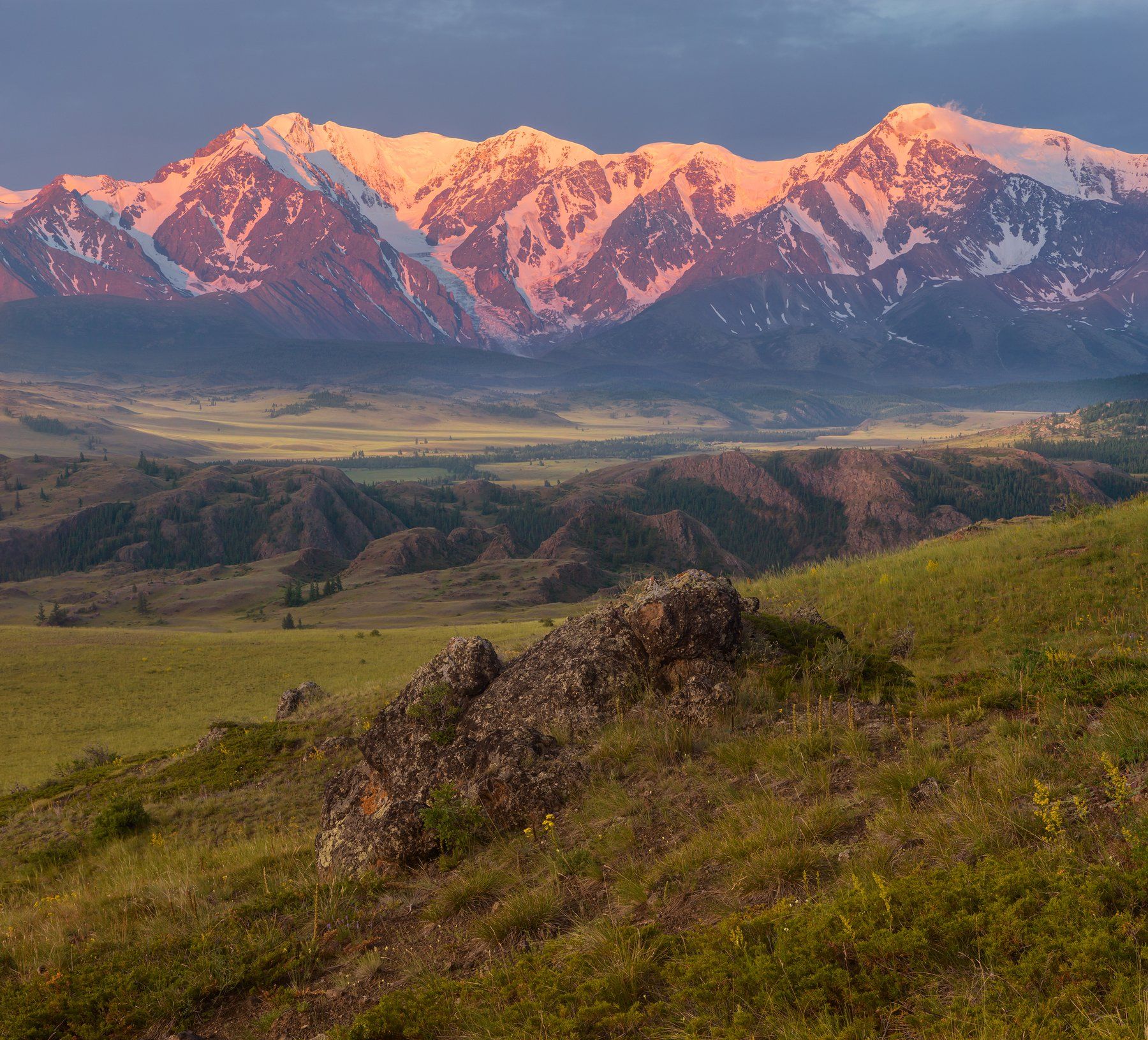 В это утро мы проспали. У Татьяны на телефоне неправильно отображалось время - на час раньше, то есть в четыре утра, когда мы должны были встать - у нее показывало три утра. А в пять утра - показывало четыре. По ее часам мы встали, но было реально уже пять утра. Забежать наверх мы не успевали. Стали снимать кто-где. Я нашел это место и снял розовый рассвет здесь, хотя рассчитывал снять с очень красивой скалой и деревом, будто растущим из нее. Когда я поднялся наверх, был уже желтый свет, но я снял эту скалу с нижней точки, чтобы увеличить размер незабудок, рассыпанных по каменистой поверхности. Чтобы попасть в это место, надо проехать через ворота за 200 руб. за машину. Наверх сопок наша машина заехать не могла, поэтому я все-таки нашел нормальных ребят на уазиках, которые могут забросить наверх всего за одну тысячу руб., чтобы поставить там палатки и не лазить по утрам и вечерам вверх. Ехать около десяти минут по извилистой дороге, которая местами крутовата для обычных седанов. Хозяева этой сопки просили шесть тысяч руб за десятиминутную поездку. Надо отметить, что цены на услуги здесь значительно выше, чем в Крыму. На Демерджи машина стоит три тысячи, ехать по очень крутым скалам от сорока минут. Здесь же легкая грунтовая дорога, просто обычной неполноприводной машине трудно местами проехать из-за относительной крутизны склона. А полноприводные зале