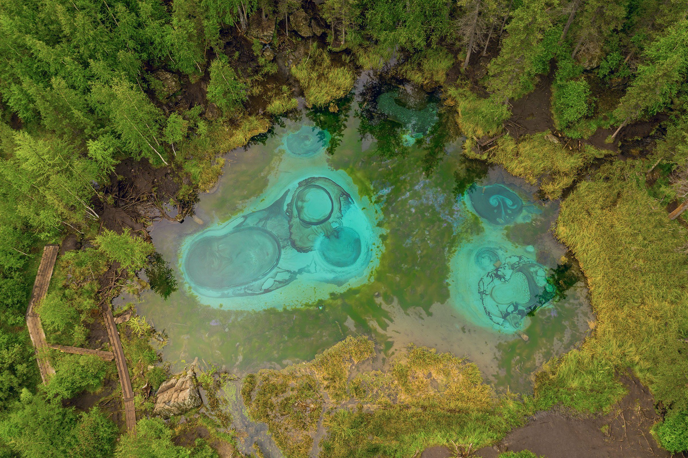 Озеро Гейзерное сверху смотрится немного иначе, чем снизу. Дело в том, что я стоя внизу человек почти не видит дна с водорослями из-за преломления лучей и видит озеро более голубым, чем сверху. Но озеро все равно кажется очень красивым и сверху. Если стоять у самого берега и внимательно смотреть на озеро, видно как оно меняется, со дна озера в воронках поднимается голубая вода и воронки меняют свои размеры. Озеро все время в движении.