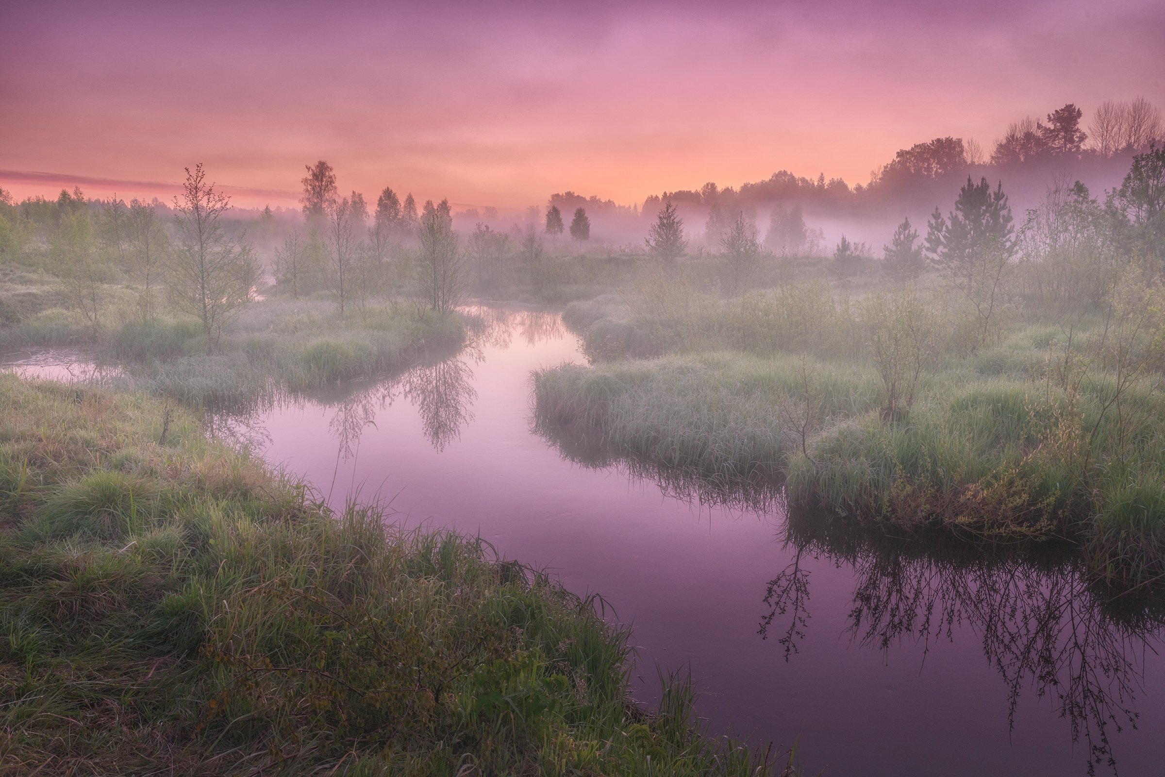 Двадцатое мая, три часа семнадцать минут утра. Восход уже накалился и рдеющее небо, смешавшись с приречным туманом, нависло над рекой и окрестностями. Я немного поеживался от проникающего, сырого и влажно холодящего лицо, тумана. Очарование пламенеющего утра пересиливало все мои не очень приятные ощущения в виде мокрых ног, холодеющей спины и влажности на лице от оседающего тумана. Мне казалось, что мгновения длятся вечно и я все переставлял штатив с места на место, выискивая более удачную локацию. Но ничто не может длиться вечно и утро заметно менялось, небо начало бледнеть и все кругом начало светлеть. Я успел сделать несколько снимков, когда из-за леса брызнуло солнце…