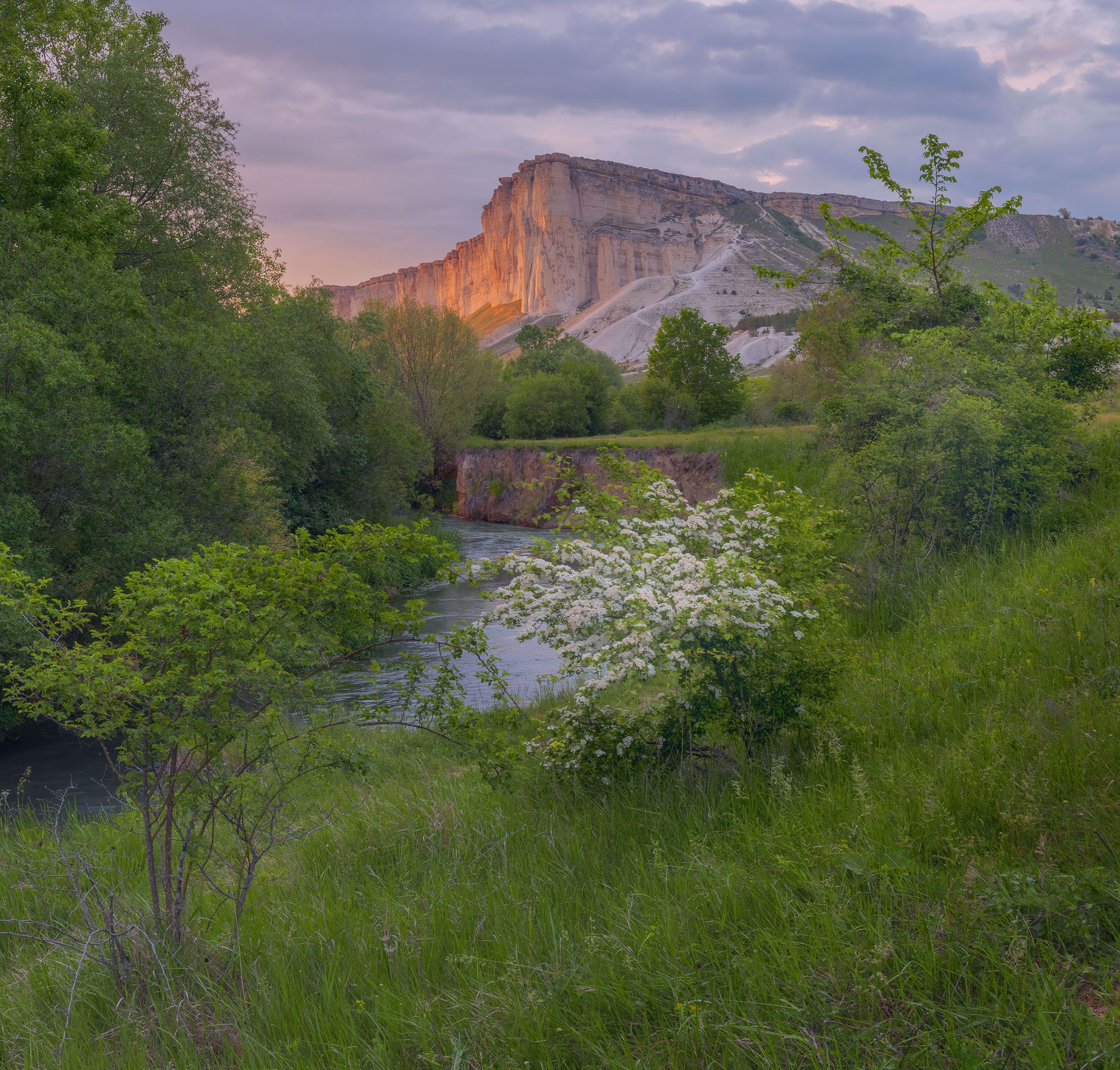 В наш первый приезд на Белую Скалу было пасмурно и цвел боярышник. Сначала мы фотографировали у самой Белой Скалы, затем перебрались на речку в места, где мы фотографировали три года назад. Но что-то там изменилось - берег реки в нужном месте исказился, красивых веток не было, не было и цветов. Такая весна. И я, оставив группу, поехал на другой берег, найдя эту точку съемки, я вернулся за ребятами и мы приехали сюда. Я на какое-то мгновение упустил боковой свет на лужайке и был наказан - свет уже ушел. Пока поставишь машину, чтобы она никому не мешала, закроешь двери, придешь к локации, и уже несколько опоздал. Правда, я наверстал это в следующий приезд и этот снимок выложил здесь немного ранее. Но боярышник уже не цвел. Здесь тихое уютное место, назойливых и упрямых туристов практически нет. Над Белой Скалой под вечер разлился теплый желтый свет, придавая всему уют, покой и тихое счастье.