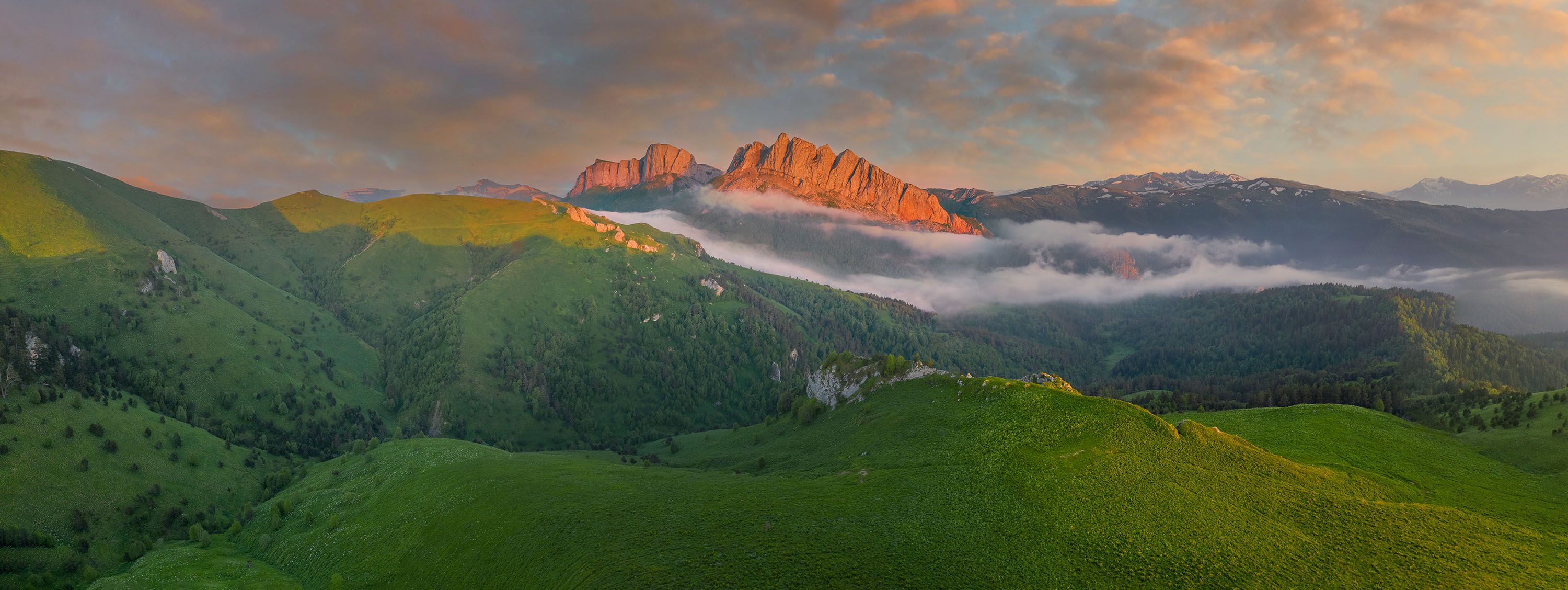 Ачежбоки хорошо освещаются и утром и вечером, Большой Тхач освещается лучше утром. Мы были под горой Асбестовой несколько дней. Начиная с 13 числа неустойчивая погода с обязательными дождями днем и солнечным небом утром и вечером изменилась в худшую сторону. По утрам были красивые восходы, но непогода с ветрами, глухой облачностью и дождями начиналась самое ранее с шести утра до двенадцати ночи и самое позднее около двенадцати дня. Пять вечеров подряд мы сидели в глубочайшем тумане или низкой облачностью, что одно и то же, видимости не было совсем. Иногда видимость была не более десяти-пятнадцати метром. Я с трудом видел соседние палатки. И только восемнадцатого числа немного развиднелось под вечер, а девятнадцатого был красивый вечер. Я около семи вечера ушел на горки в обратную сторону от горы Асбестовая, поднял дрон в 19:40 и начал снимать. Появилась невысокая облачность под Ачежбоками, которая увеличивалась каждую минуту. Я сделал двухрядную панораму из восьми снимков и каждый снимок снимал в HDR. Солнце горело еще несколько минут. Я опустил дрон и пошел к краю горки с видом на солнце. В горной теснине бушевали туманы и облака, подсвеченные последними лучами солнца…