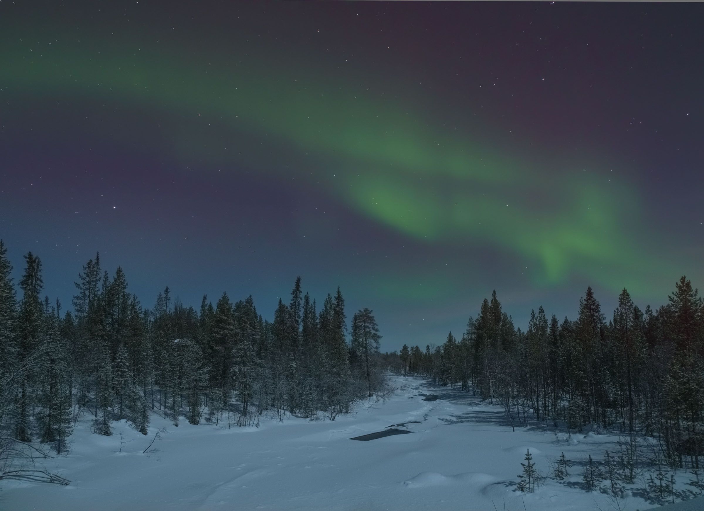 Этот снимок сделан над одной из дорожных речек. Если есть какой-то цвет на снимке, его всегда можно вытянуть. Если нет какого-то цвета на снимке, его не вытянуть. Можно сделать, но не вытянуть. Красное глазом плохо виделось, да, впрочем, и зеленое слабовато. Камера видит лучше. Вообще некоторые снимки мы снимали и только на мониторе камеры видели, что сияние есть. Так было в первое сияние.