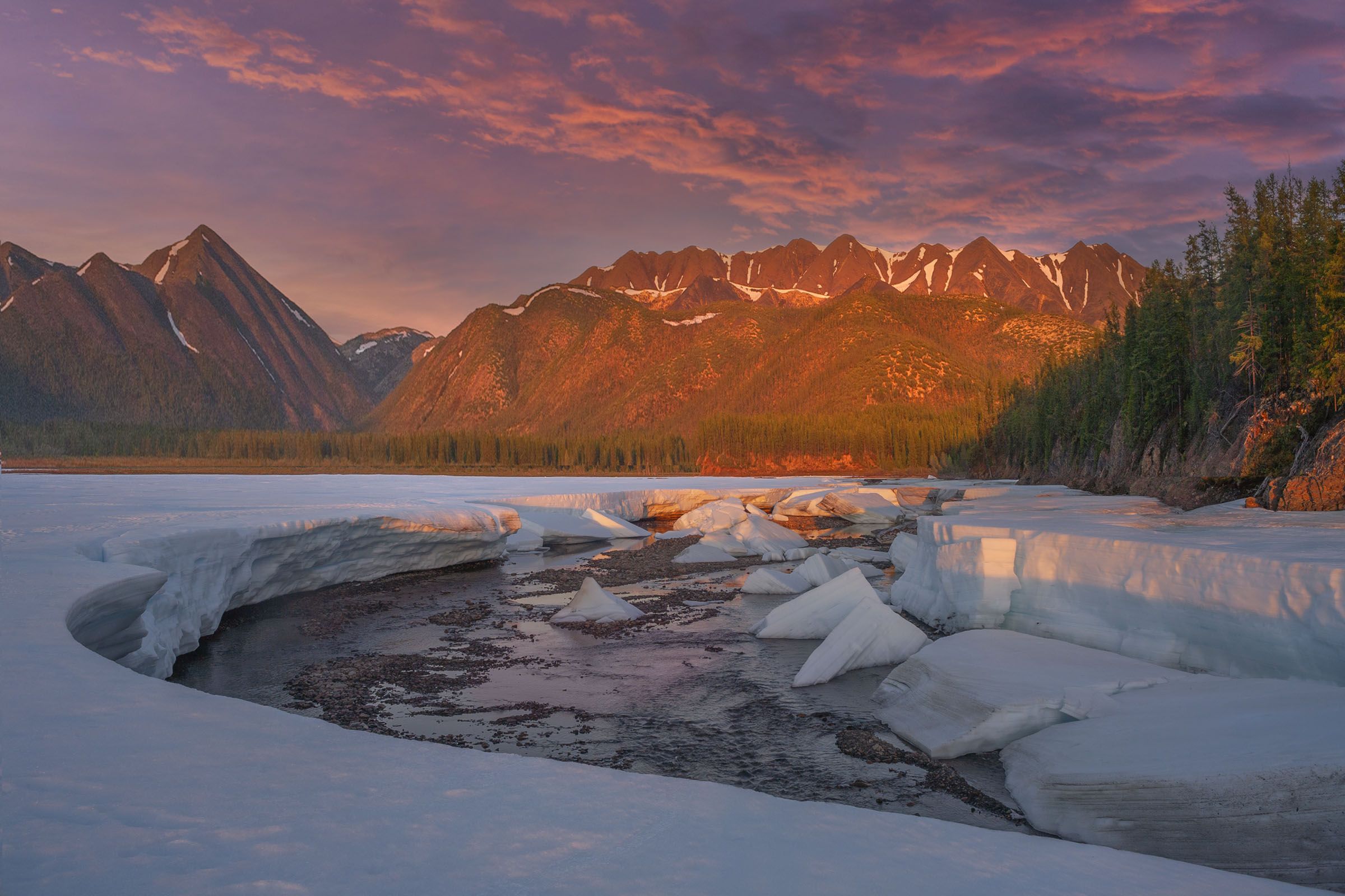 На этой наледи мы провели два дня. Поставили палатку прямо рядом у наледи и ходили на нее. Это был конец июня, двадцать седьмое число. Небольшая река, на которой образовалась наледь, уже прорыла в ней большой канал-промоину, и которая и была самым интересным местом на наледи. Толщина наледи в среднем была два-три метра и местами достигала метров пяти. Дни были, несмотря на конец июня и резко-континентальный климат на центральной Колыме, какие-то вялые и безликие, с каким-то мелко моросящим иногда небом. Я часами лазил по наледи, пытаясь найти что-нибудь стоящее для снимков. К вечеру сопки и небо неожидаемо загорелись в вечерних лучах. И я сделал серию разных фотоснимков.