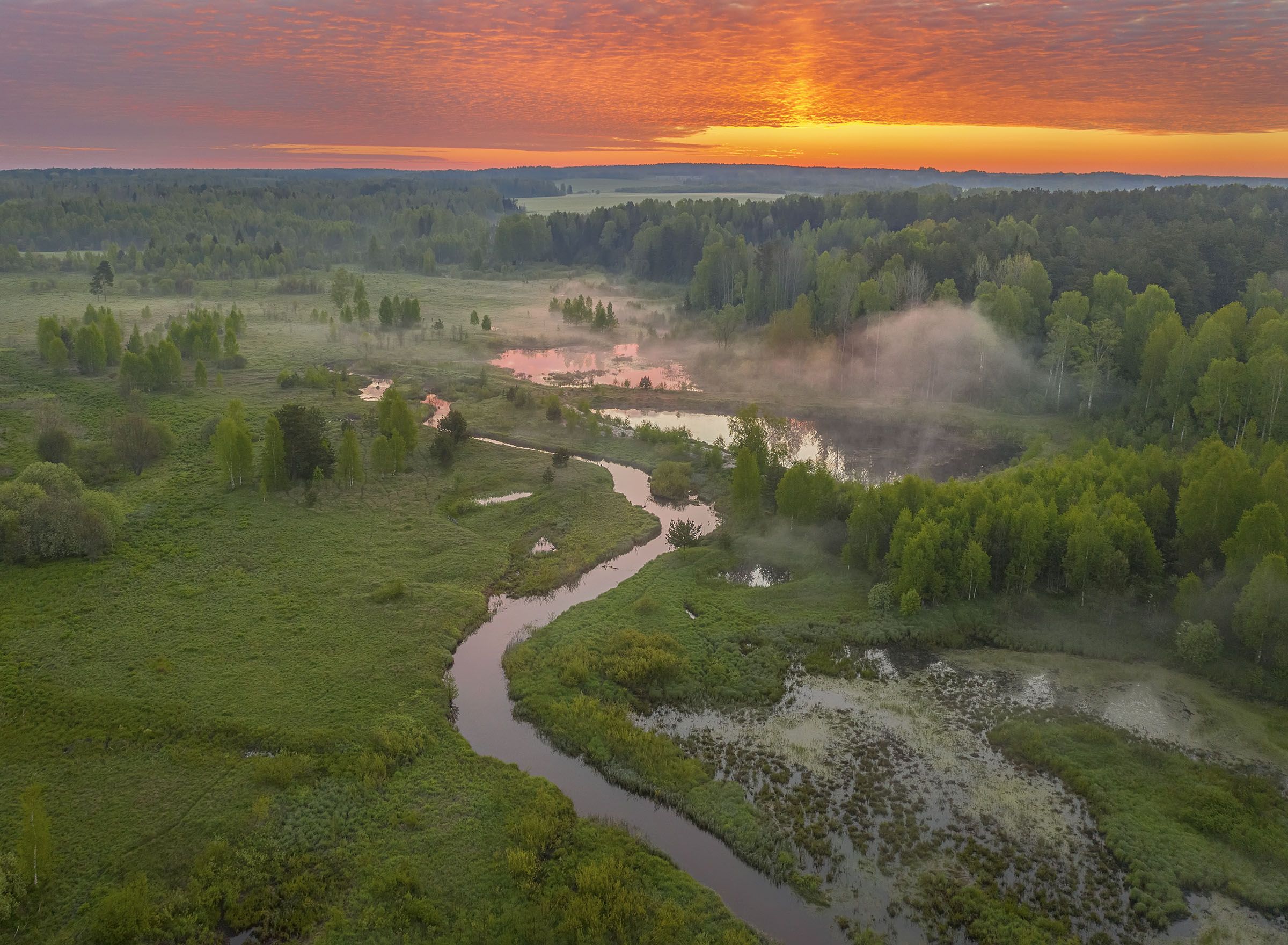 Раннее утро в моей деревне. Двадцать девятое мая, 3:16. Встал полтретьего, прошел к реке. Облака предвещали хороший рассвет, когда небо закраснелось, я поднял дрон и сделал серию снимков с рекой. Вода немного парила и над большим прудом повис горбатый туман над рекой за дальним прудом. Вода зарозовела от отражений желто-багровых облаков.