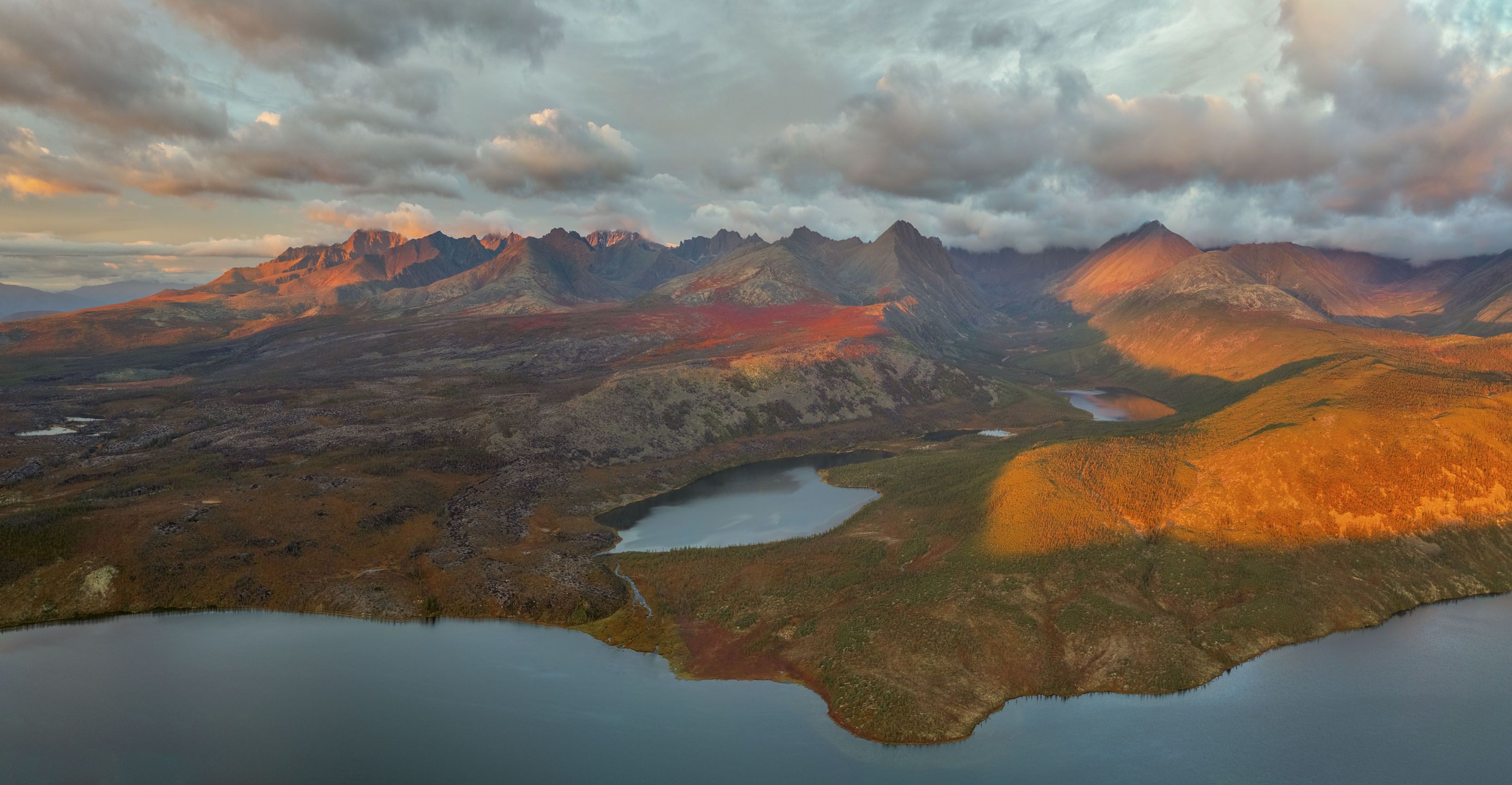 Третье сентября. Как не планируй тур, обстоятельства всегда вносят правки. То дожди, то снегопады, то морозы, то сильные ветра и плыть по озеру нельзя, то еще что-то, да просто пасмурно... Мы планировали переплыть озеро второго сентября, чтобы перебираться на ручей Неведомый и его горделивые озера, но сильный ветер поднял волны даже на Косе Биологов, а на основном зеркале озера бушевали большие волны. Рисковать не хотелось, тем более, что я удлиняю фототуры, чтобы хватило времени при любых раскладах, и можно было подождать на такой уютной песчаной косе. Запас времени у нас был. Тут для себя я открыл высокие точки съемки с дрона и стал поднимать его на пятьсот метров. Этот снимок сделан с высоты пятьсот. Это панорама, соединил два снимка. Времени шесть ноль четыре утра. Хорошо виден весь хребет Большой Аннгачак, долина ручья Неведомый с озерами. Пила и пик Фестивальный скрыты плотными тучами. Северный рассвет озаряет грандиозную панораму. Кажется, что я уже бесконечно привык к этим местам, но каждая поездка дает новые впечатления. Наверное, так и должно быть. Видны следы пожара 2020 года. На снимке это склон плоской сопки, левей Соседнего озера. Оно ближнее за озером Джека Лондона. И видно, что пожар накрыл часть плато левей, до самой Стоозерки, где видны озера. Тот, кто посещает озеро Джека Лондона, должен быть очень бережным к этой природе. Это же природный парк, самое уникальное место на всей Колыме. Так мало того, что люди создают пожары по безответственности и безалаберности, целая банда, другим словом не могу назвать, псевдотуристов с Урала вырубила деревья на самом берегу озера, чтобы сделать карскас для тримарана. Пожелали своего поганого бабла, чтобы отправить в Магадан металлический каркас. Я напишу в Администрацию области, чтобы разобрались с этими скотами. Других слов для них у меня нет.