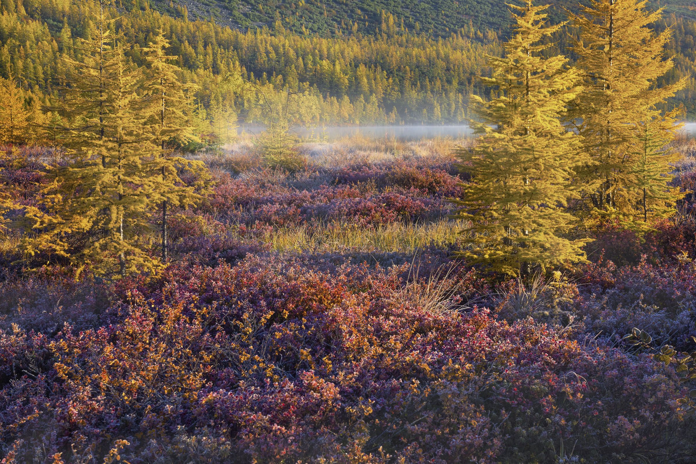 Утром выдался небольшой морозец и он покрыл изморозью кустарники и небольшие деревца. Осенние красно-багровые березка Миддендорфа и пурпурно-багровые кустарники голубики и темно-красные листики арктоуса создали непередаваемую по очарованию картину береговых пейзажей в сочетании с небольшим туманом над озером. Это мой любимый цвет – он бывает, когда в мае цветет маральник на сопках на Алтае или на Байкале, под Читой и в других местах, он же рододендрон Ледебура, осенние кусты голубичника в сочетании с другими кустарниками, покрытие изморозью, которая придает цветовую глубину и насыщенность всем кустарникам. На солнце кажется, что они горят пурпурным с синевой огнем. Как будто ты находишься на другой планете, под другой звездой. Неизъяснимое удовольствие смотреть на редкое и особенное волшебство природы…