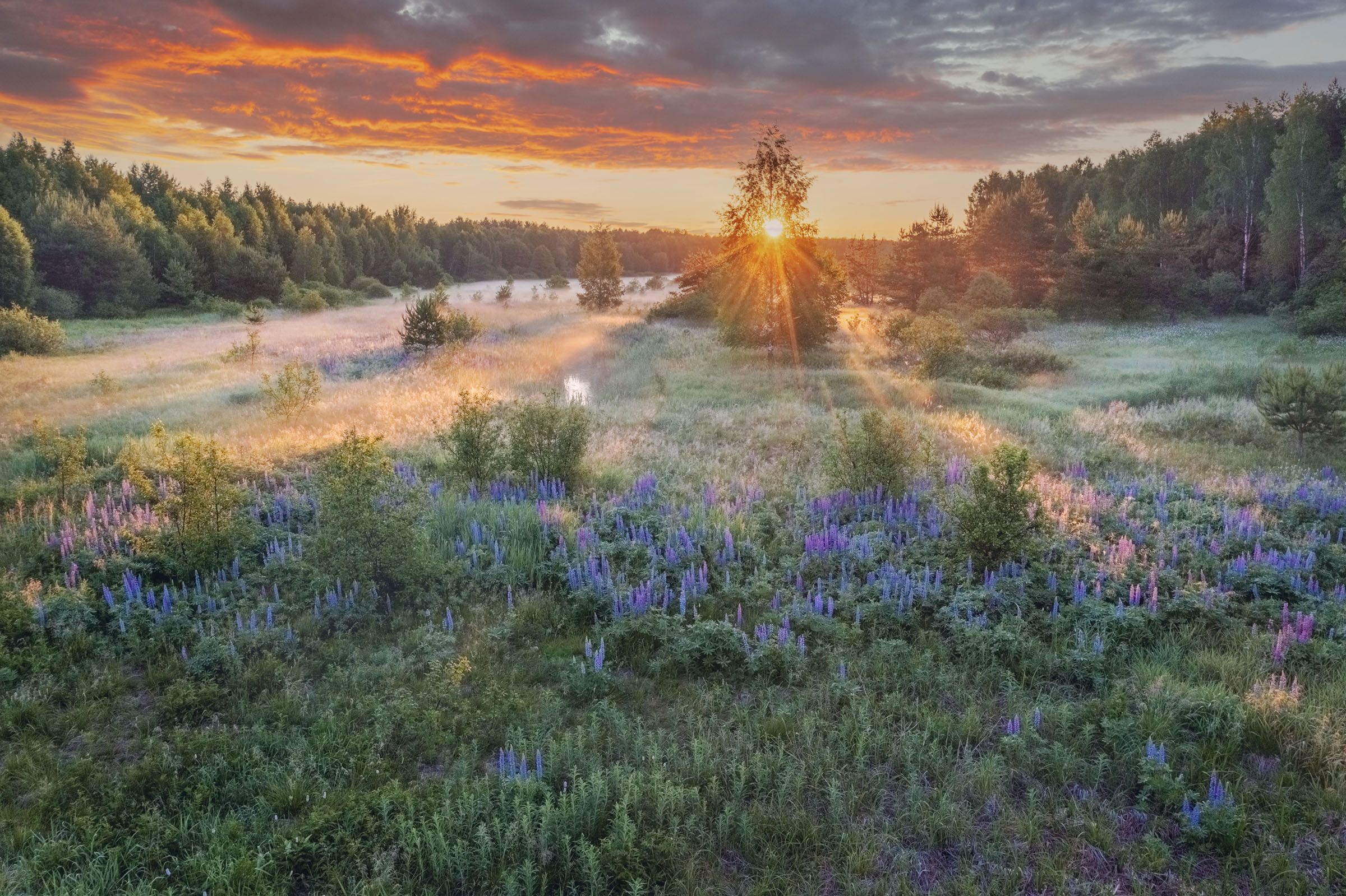 Глубокая дождливая осень навевает мысли о чудесных днях, проведенных в деревне этим летом. Такая ностальгия по лету. Много солнца, тепла, утренней свежести, чудесного настроения. Вспоминаю июнь, когда все цвело. Для меня это лучший месяц в году. Этот снимок я сфотографировал с дрона с небольшой высоты. 3:37 утра. Природа просыпается, все в обильной росе. На переднем плане люпины, цвет которых сильно зависит от освещения – там, где они в тени, они синеватые; там, где их освещает утреннее солнце, они с отливом сиреневого пурпура.