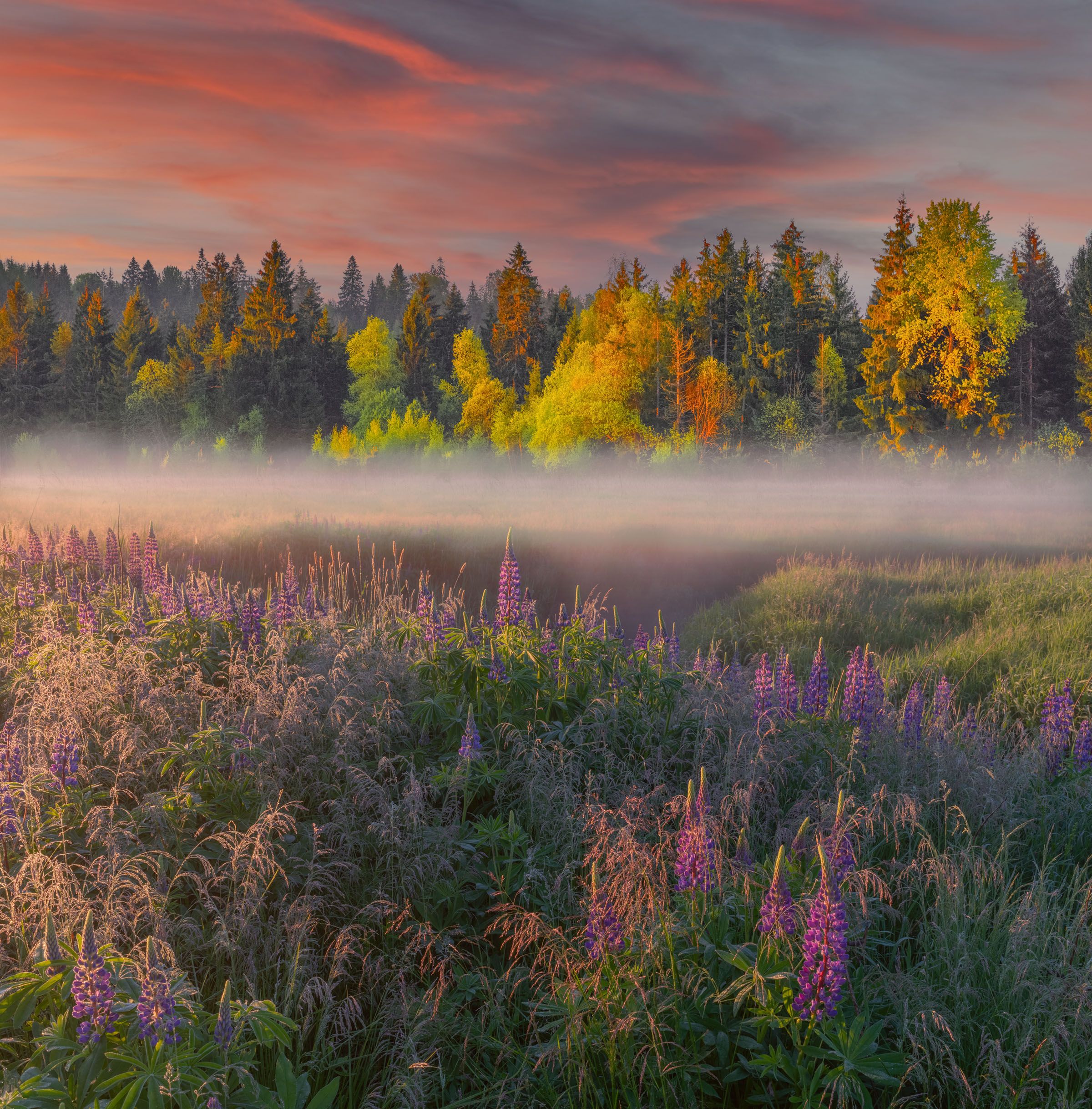 Это летнее утро было особенным, лес сиял промытый вчерашним дождем. Все задалось так, как хотелось увидеть. И даже светло-багровые облака были к месту. Роса была чрезмерно обильной и я был весь мокрый по пояс с полными сапогами набравшейся воды с росистой травы. Я осторожно ходил среди чудесной природной сказки, ставя штатив с камерой и примеряясь к будущим снимкам. Когда чувствовал, что попал, ставил штатив крепче, более точно наводился на границы кадра и фотографировал.