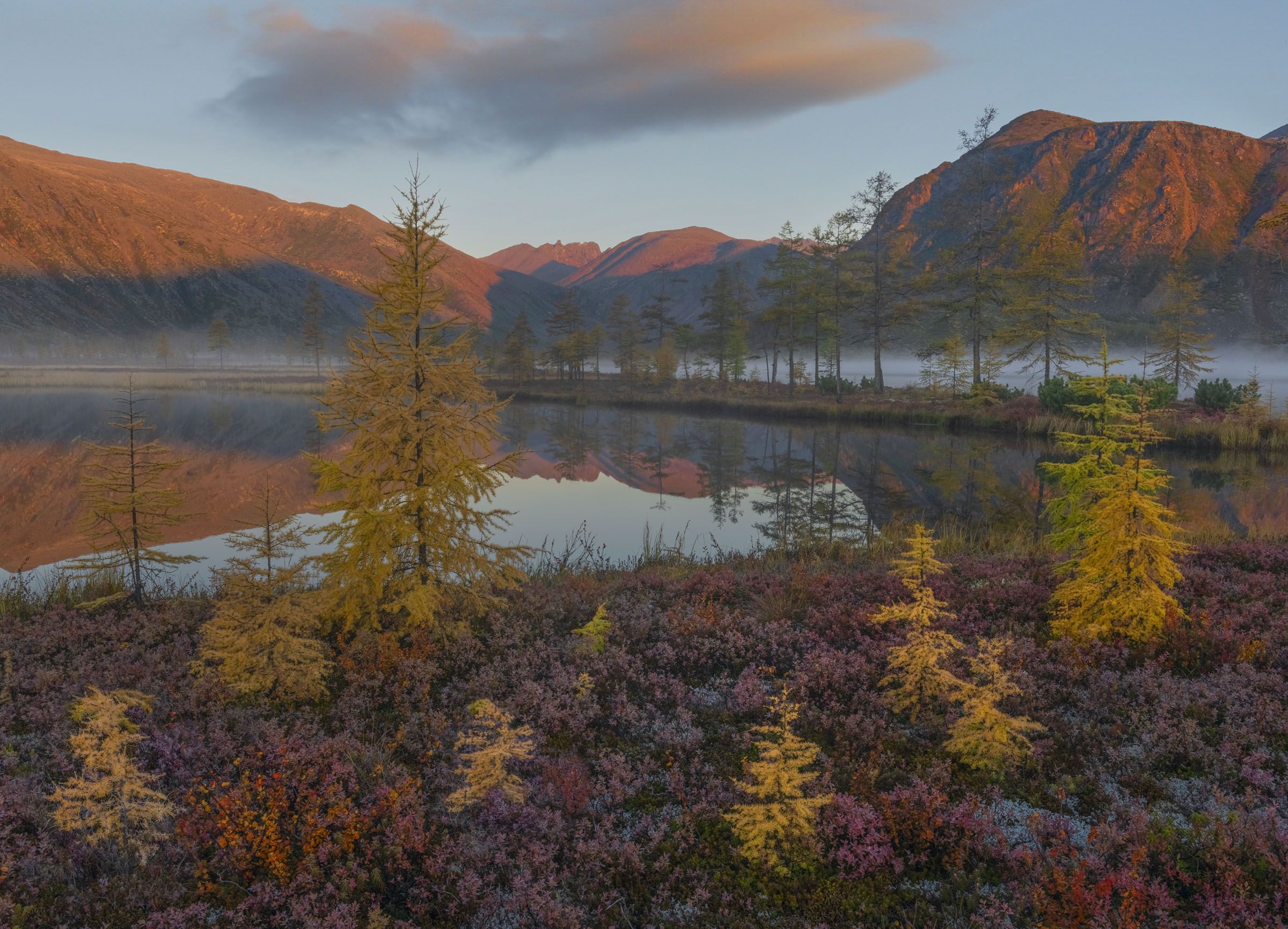 В это утро был чувствительный морозец, и с самого утра голубичники стали бело-сиренево-пурпурными. Потом немного отпустило и пока я бродил по всяким зарослям, с голубичников ушла белизна, но появилось какое-то внутреннее свечение. Именно такие изнутри светящиеся сиренево-пурпурным светом голубичники, арктоусы, березка Миддендорфа или цветущие маральники на Алтае, Байкале, Чите, Туве и еще где-то, сон-трава – являются моими самими любимыми колоритами. В такие моменты я впадаю в экстатические состояния и необыкновенного захватывающего счастья. Почему так, я не знаю, но еще в детстве я отметил, что когда рисовал карандашом какой-то пейзаж с рекой с красным обрывом, что красный цвет меня приводил в необъяснимый восторг. Теперь вот более сложная гамма цвета приводит необыкновенные состояния, все равно с красным цветом в основе. Почти все утро я фотографировал багрово-пурпуровые пейзажи…