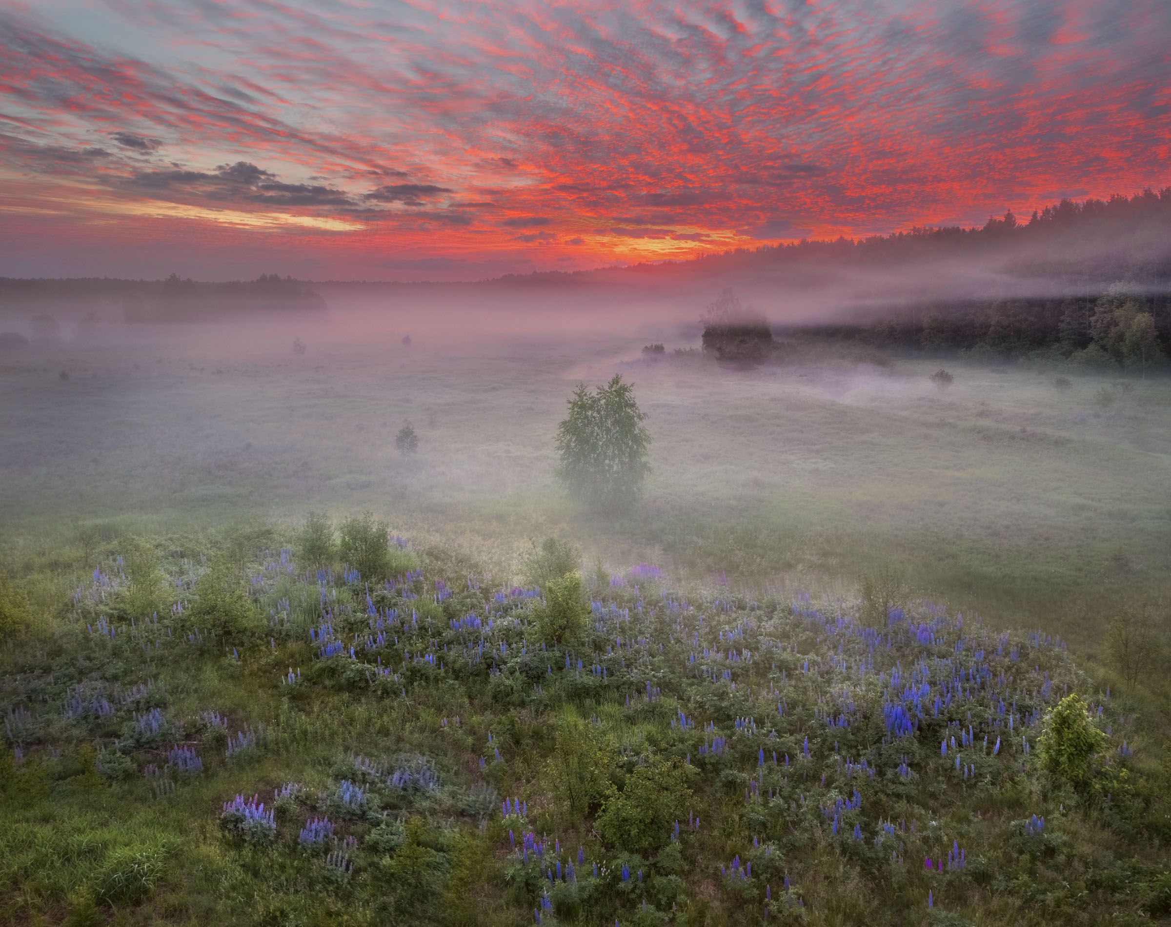 Вид с дрона на поле, находящееся рядом с рекой Серьгой. 24 июня 2022 года, 2:22 минуты. Светает в Нижегородской области немного раньше, чем в Москве, минут на сорок. Это место стало одно любимых мною. Сюда ехать от деревни минут двадцать. Людей здесь не бывает, сельхозработы не проводятся и поля постепенно зарастают. Здесь всегда тихо и девственно. Я провожу последние годы фототуры, но июнь месяц решил опять не проводить. Поеду в любимую деревню. Там настоящий рай. Этим летом в июне также буду много там фотографировать. Дом у меня большой. Если кто-то пожелает поехать со мной - пожалуйста. Договоримся...