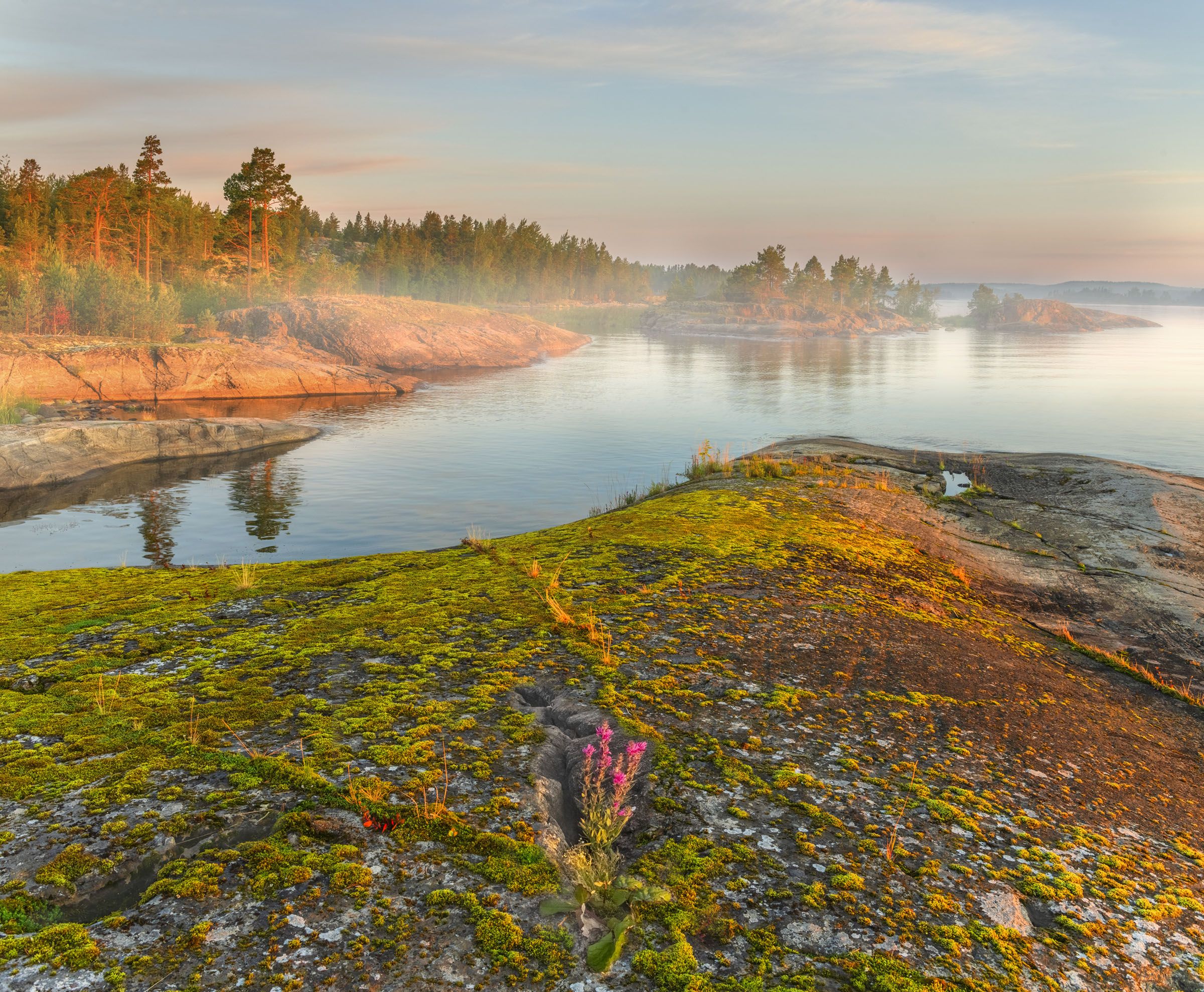 История Ладоги еще не изучена. Вроде озеро образовалось от удара астероида. Об этом свидетельствуют его круглая форма и разломы в камнях. На озере очень много покатых, выглаженных камней. Видимо, это действие ледника и многолетнего воздействия озерных волн. Вообще для фотографов большой прелестью являются такие выглаженные камни с удивительной фактурой самих камней, трещин, растущих на них мхов, цветов. На снимке, на переднем плане, частые цветы Ладожского озера – Дербенник иволистный. Красные вытянутые головки этих цветов показывают пример упорства жизни, они появляются там, где их совсем не ожидаешь увидеть, цветы растут в совсем непригодных для жизни местах, среди скалистых берегов.