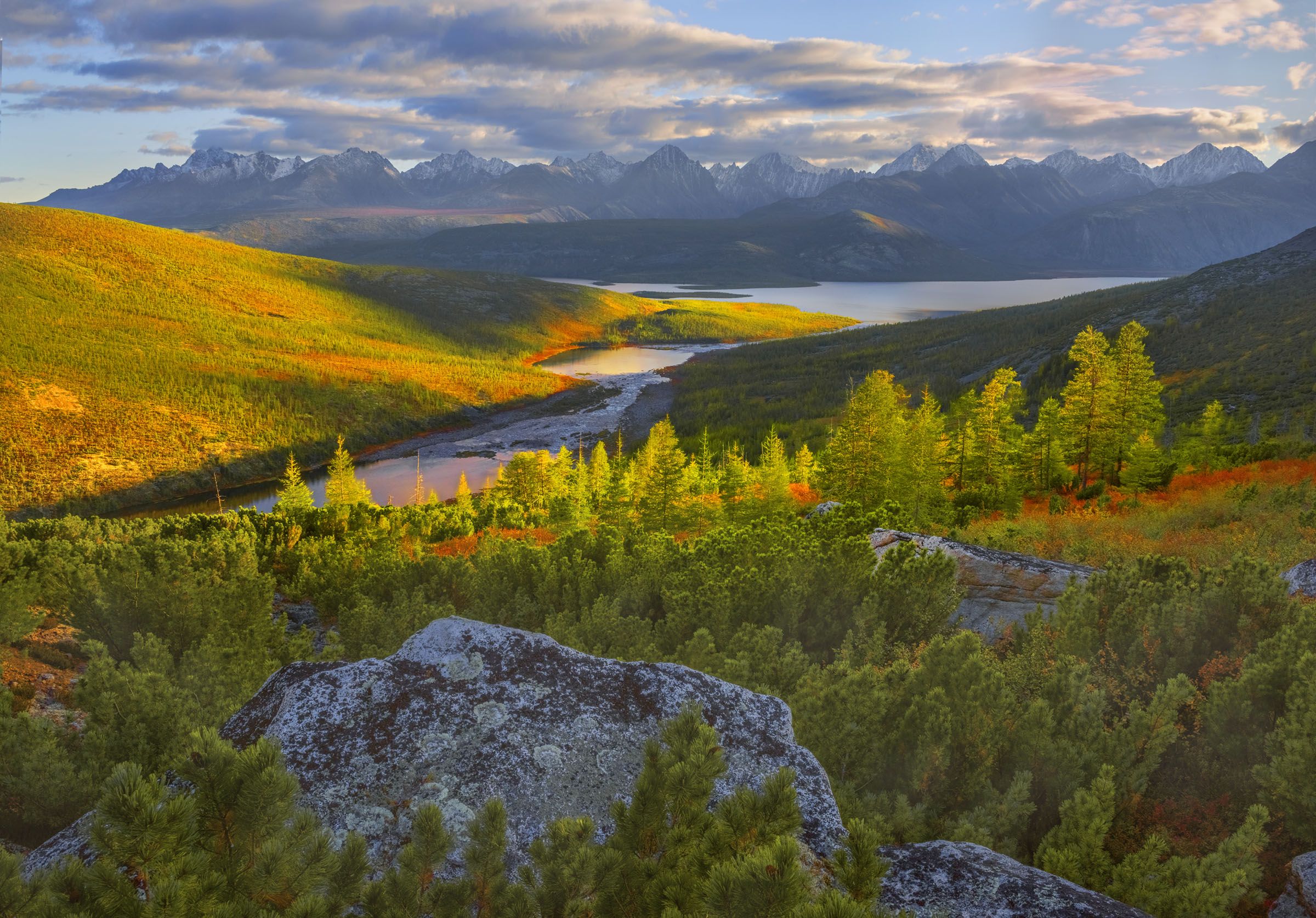 Я фотографирую с плато над озером Танцующих Харисов, куда мы поднялись с ночевкой. Осень еще в самом начале. Солнечные лучи высветили светлую полоску на среднем плане и она заиграла светом и красками.