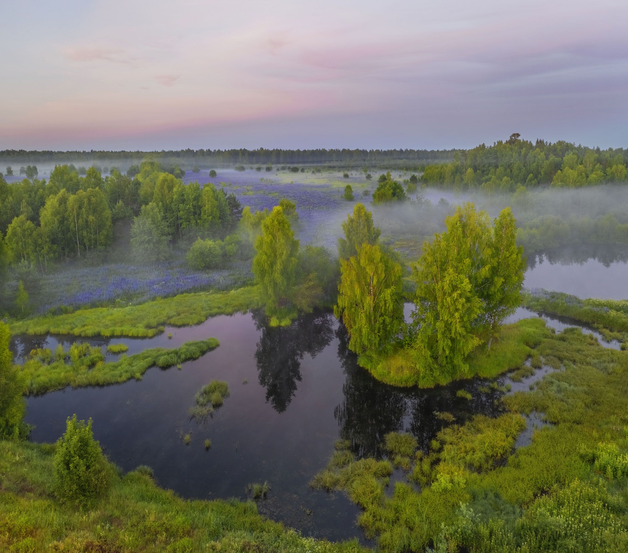 Этот снимок сделан 28 июня в 3:05 с дрона. Поле за прудом заросло наглухо люпином и он матово светится своими фиолетовыми оттенками. Люпин отцветает и вблизи уже не так хорош. Только издали смотрится хорошо, да где-то еще в тени сохранился в цвете. Практически весь июнь я вставал от двух ночи до полтретьего, в зависимости от того, далеко ли ехать и сколько времени идти от машины до точек съемки.
