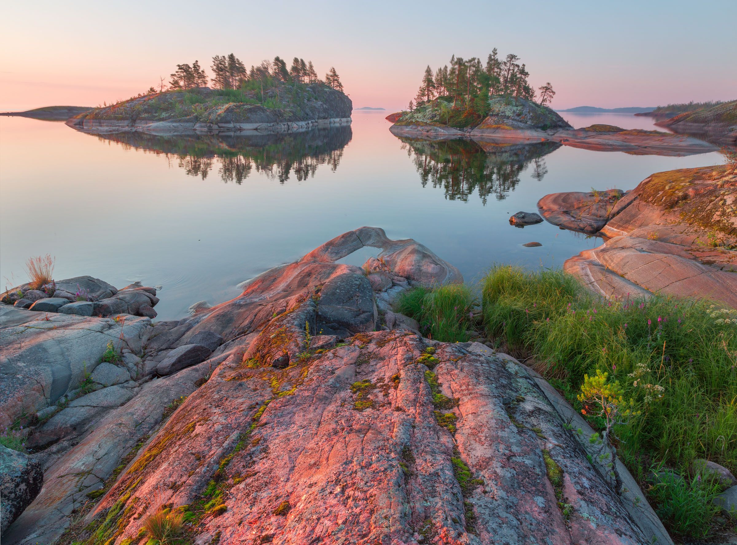 На этот раз мы встали совсем рано, около полтретьего. И вчетвером, еще во мгле, поплыли на острова. От стоянки плыли до островов около пятидесяти минут. Предыдущим утром не рискнули, была большая волна, и надо проплыть по открытой Ладоге около четырех километров. А с ней шутки плохи. Это утро было тихим, мы медленно двигались на чернеющий вдали мыс. Небо потихоньку розовело, и все лучше были видны берега. Туристы стояли там и сям. То байдарочники, то с моторными лодками. На этот раз мы выбрали необычную локацию для восходной съемки и уже после восхода мы спустились с высокого берега к лодке и переплыли на мысы, откуда я сделал этот снимок. Только Игорь из Нижнего Новгорода остался наверху, но и он потом пришел, пробравшись непростым берегом к нам.