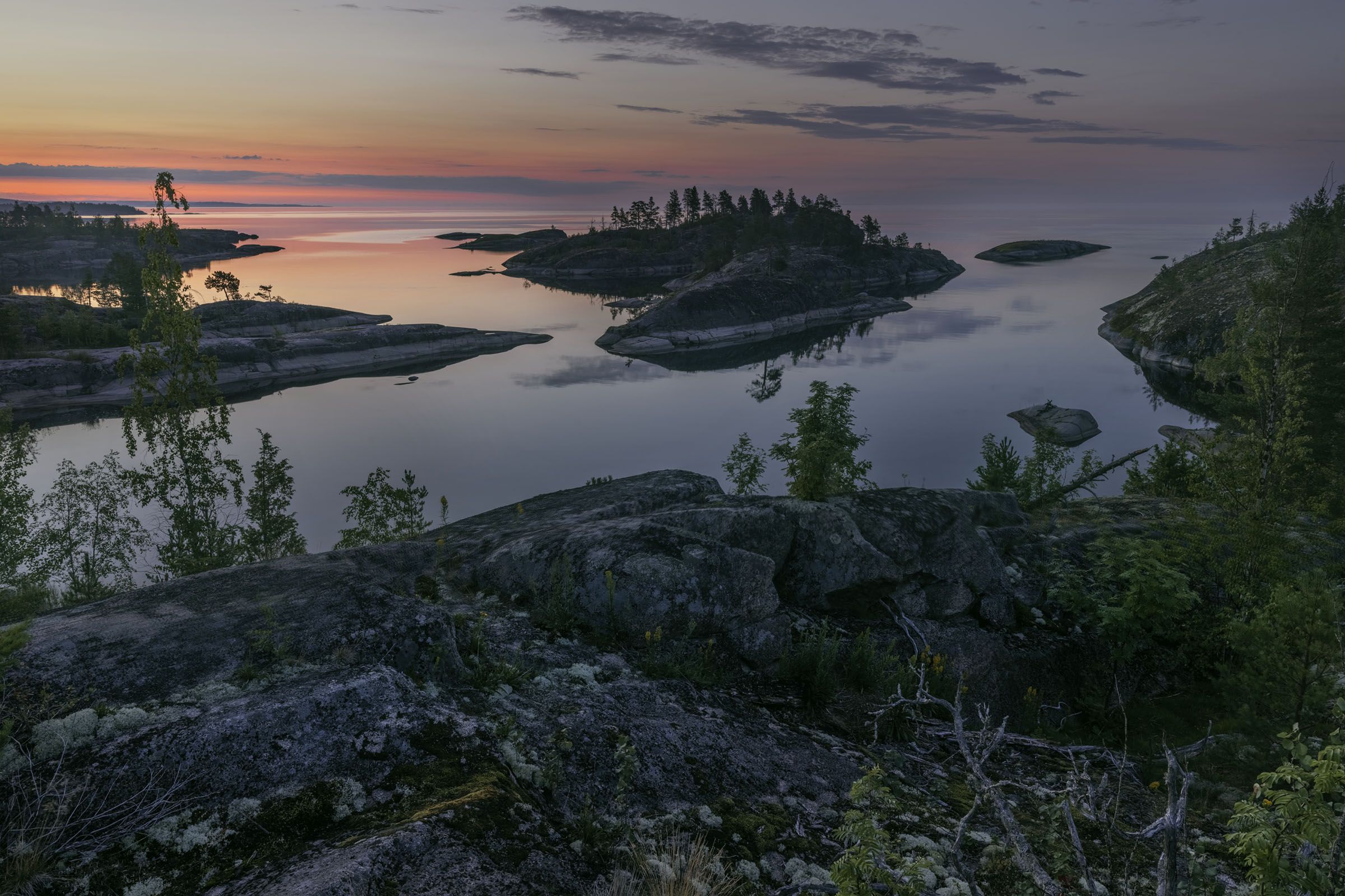 Первое августа 2023 года. 3:57. В это утро мы встали раньше обычного, и выплыли на три знаменитых острова. Плыли почему-то почти пятьдесят минут. Кое-где на пути в открытой Ладоге были торчащие острые камни, они были очень опасны. И когда мы огибали острый мыс по пути, около него в волну мы видели ранее крупные покатые камни под водой, они иногда обнажались с сильной волной – в этом месте можно было оторвать задний борт лодки с двигателем. Поэтому я сначала брал сильно влево, так как в ночных сумерках камни были практически не видны, я ориентировался на алеющую зарю на северо-востоке и черный берег вдали перед ней, потом брал на мыс и брал сильно вправо, чтобы не налететь на покатые камни под водой. В штиль они были не видны. Лодка мерно гудела, слабый встречный ветерок едва трепал волосы. Была еще ночь и тишина, только иногда тихо булькала лодка, пахло озерной водой и иногда с берега доносились вкусные запахи вчерашних костров. Мы с самого начала решили забраться на эти берега, с которых сделан снимок, заглушив двигатель, возле островов, тихо вошли в бухту и причалили у берега. Забрались наверх и осмотрелись. Вид был хорош. Осталось только ждать. Мы меняли локации, примеряясь к снимкам. Три острова слились в одно черное изваяние. Заря уже горела во всю…