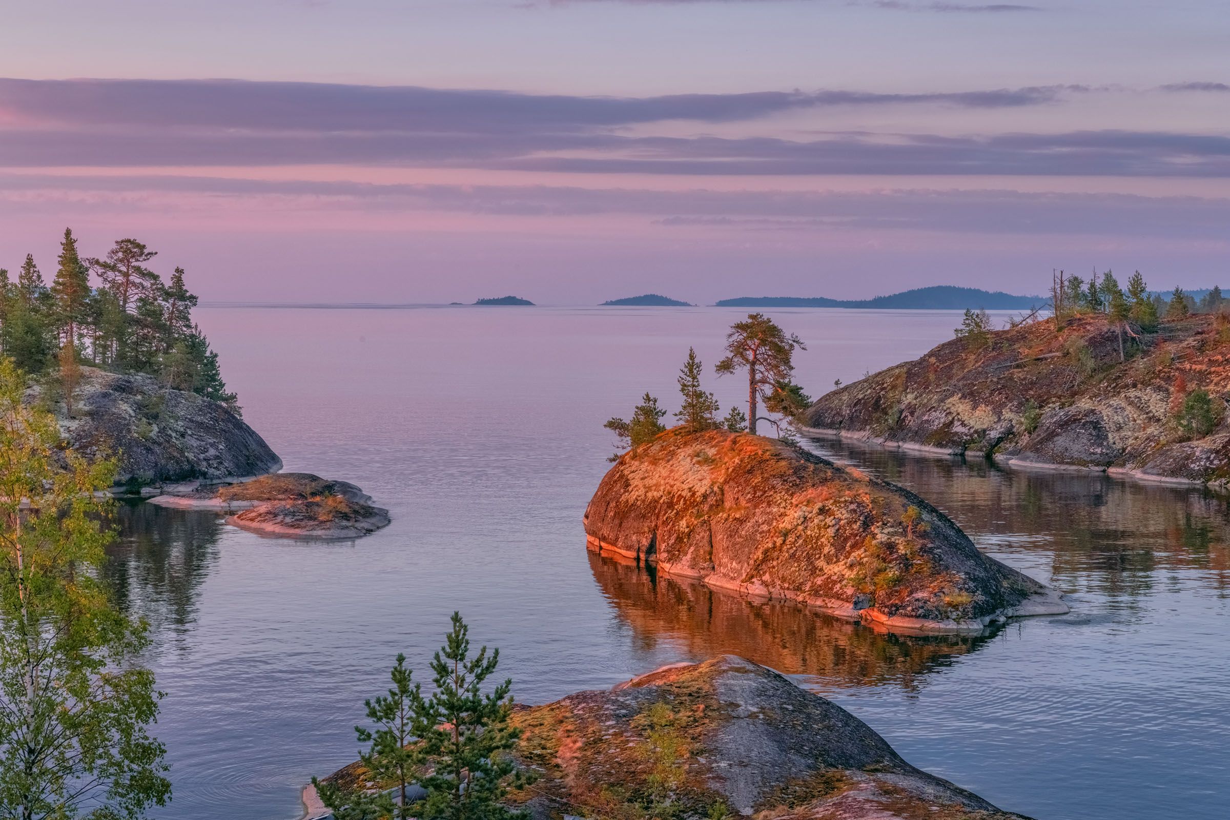 Это место по своей прелести и удивительной гармонии округлых островов с морем Ладоги не имеет равных на всем огромном озере. Здесь всегда хорошо – и утром, и днем, и вечером. Но лучше утром. В это время особый мягкий свет, правильно освещающий острова, и кроме того – мала вероятность нахождения здесь других людей, которые могли бы помешать фотосъемкам. Хотя такие встречи не исключены и у меня были дважды. К сожалению, оба раза с негативом. Одна команда фототуристов - питерцев поставила большую лодку прямо в фотографическом месте, поставили также палатки на том месте, откуда фотографировать, и, самое главное, они развели огромнейший костер, который мешал абсолютно всему – и дымом и огромной, слегка дымящейся, черной язвой кострища утром. Ну ладно, палатки проблемно переставить, но лодку перегнать на тридцать метров – нет проблемы. Но и лодку они не перегнали, несмотря на наши просьбы. Вторая встреча была с москвичами. Она была еще хуже. Они поставили лодку, прямо перед нашими глазами и мы не могли фотографировать с этой локации. Мне пришлось встать наперекор им в таком месте, что они тоже не могли фотографировать. Они долго кричали на нас, но потом все же руководитель перегнал лодку на двадцать метров и все успокоилось. Культура, культура нужна внутри.