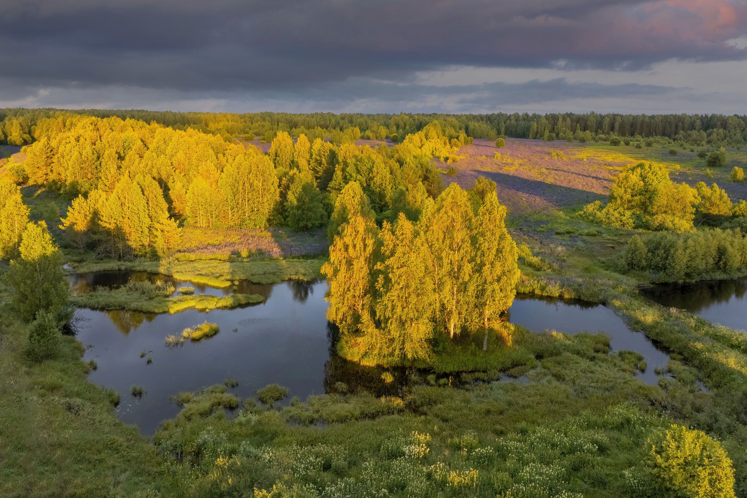 В этот вечер поехал наудачу. Днем было солнце с красивыми кучевыми облаками, но к вечеру затянуло облачностью. Я приехал к прудам и стал ждать. Все было серо и блекло. Когда лопнуло терпение, собрался ехать домой, как вдруг откуда-то вырвался луч и высветил магическую цветную полосу. Я быстро взлетел и стал барражировать. Иногда садясь. Стал смотреть на проемы в облаках, где было солнце и при приближении проема к солнцу, опять взлетал. Наконец, мне повезло, и лучи стали брызгать одни за другими. Снял много сюжетов и все с разным освещением. И все хорошие. Выбрал этот, но есть десятка три с другим светом, не хуже этого. Просто с другим.
