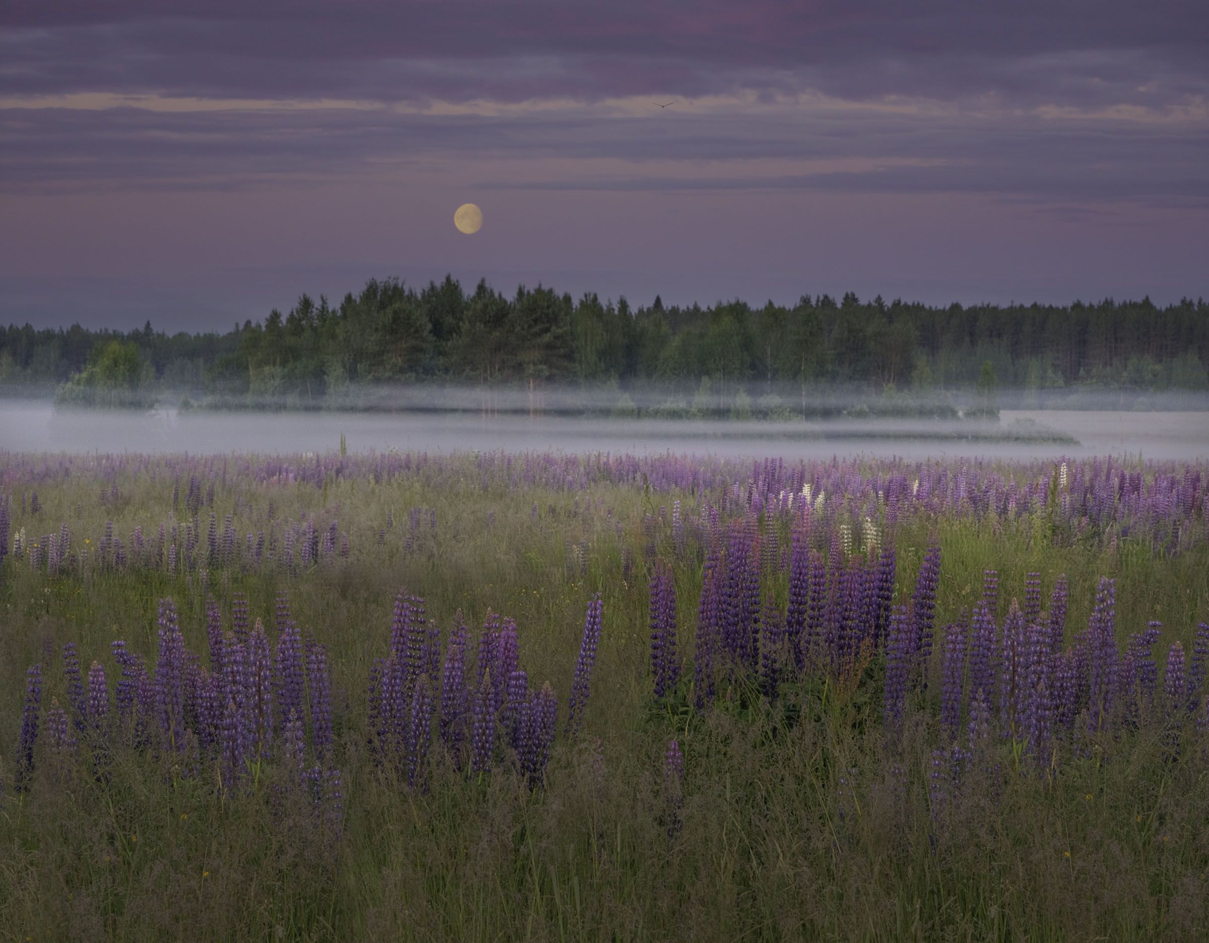 Этот снимок сделан по дороге к одной очень милой деревеньке. Трехслойный туман протянулся полосами перед лесом, за люпиновым полем и мы не утерпели и фотографировали в этом месте.
