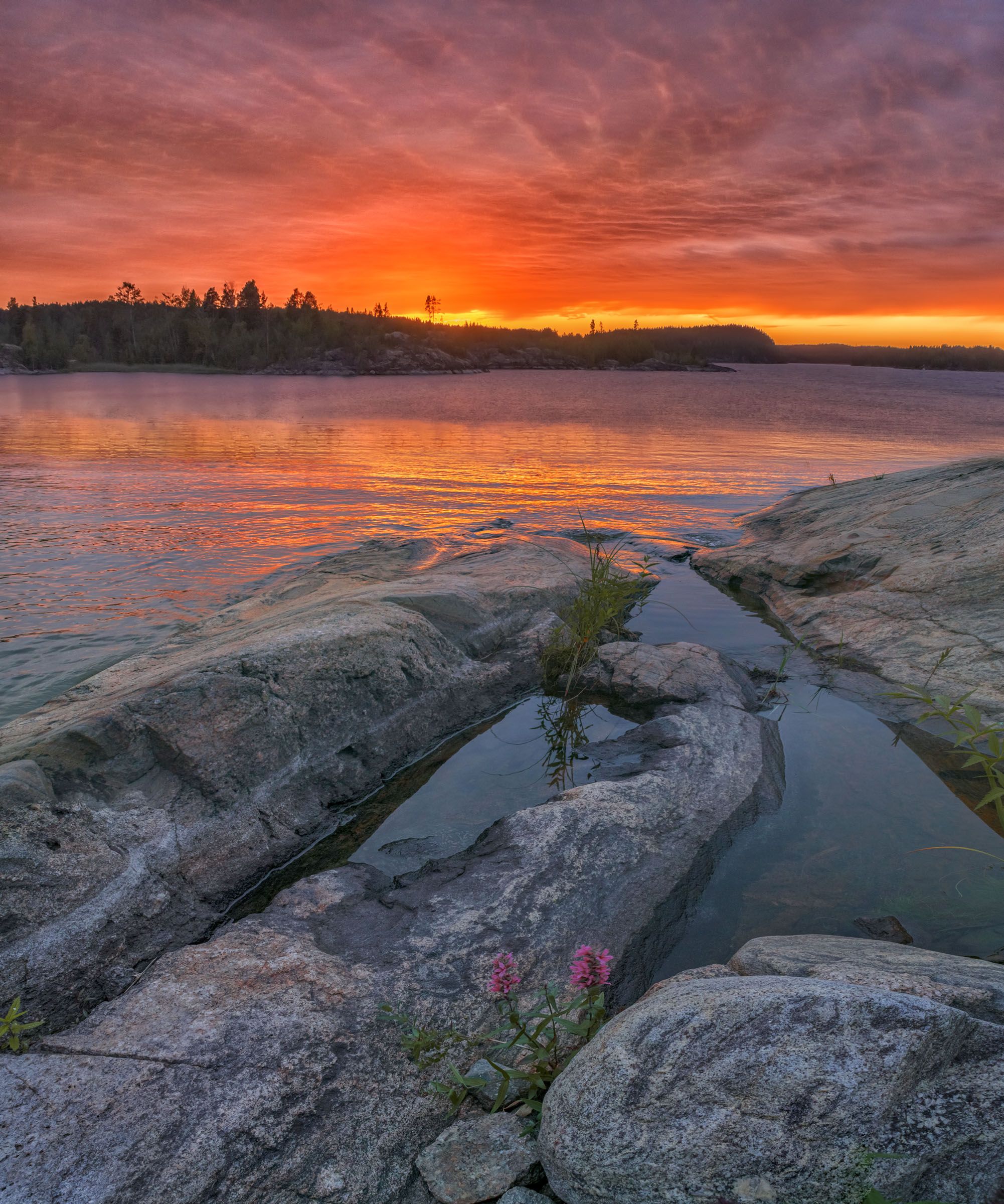 Снимок из архива по Ладоге. Мы стояли на этом же острове, что и в этом году, большой командой, только в заливчике, который выходил в громадный залив. Стоянка там очень плохая, грязная, кривая, но место для фотосъемок чудесное. Вечером я опять с ребятами пошел на северную оконечность острова. В этот вечер был сумасшедший закат, да такой, что все небо покрылось ползучими красными змеями. Иногда с закатами бывают такие явления – вроде уже все закончилось и ты куда-то уходишь, а потом он вспыхивает с такой силой, что потом будешь жалеть всю жизнь, что не снял его. Характер фотографа пейзажиста должен быть терпеливым, стойким – надо ждать до упора! Иначе можно пропустить редчайшие явления в природе. После съемок этого заката я двинулся к лагерю, закат начал гаснуть. Но он разгорелся еще сильней через какое-то время, но меня уже не было на этом месте, то есть там, где можно фотографировать. Я был в лесу. Когда я пришел в лагерь, Маша показала мне свои снимки, когда на небе было сврхсумашедствие. Я чуть в обморок не упал. У меня остался только такой закат.