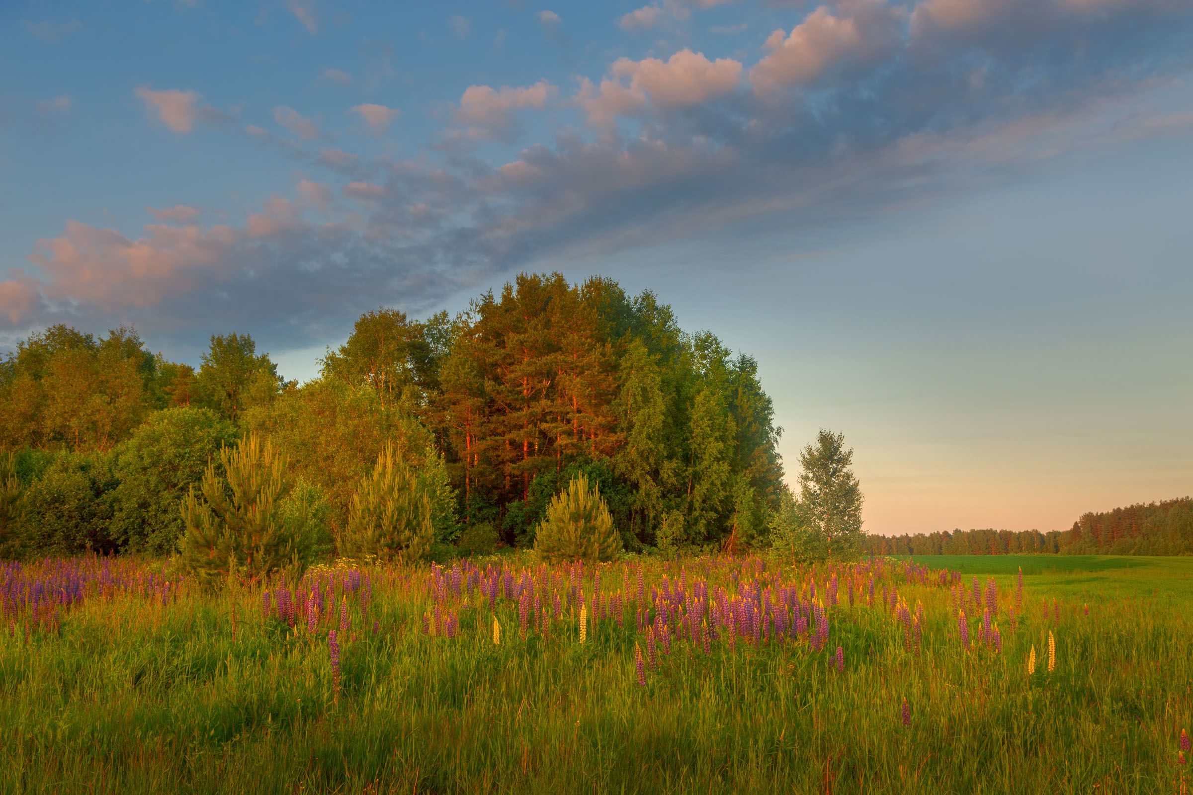 Девятнадцатое июня 19:43. Напомню, что наша деревня находится восточней Москвы километров на четыреста и немного северней. А время московское. Поэтому раньше светает, и раньше вечереет. Небольшой перелесок перед бором, который на снимке справа. В моем детстве бор был могучим и диким. Туда мы ходили за черникой. Этот перелесок рядом с деревней, ну может с полкилометра.