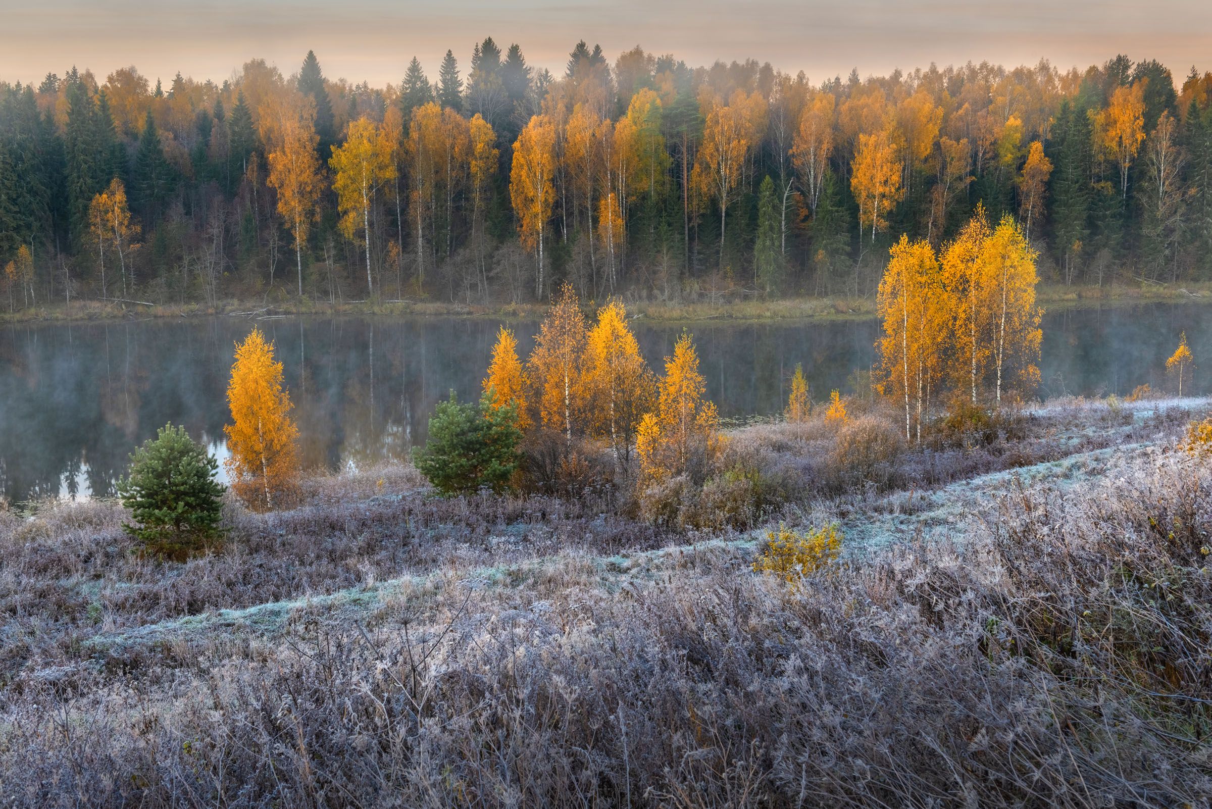 На снимке, одно из озер в Андреапольской группе озер. На эти озера мы дважды ездили осенью, в основном, предпочитали май, июнь, июль. Хотя бывали и в январе, марте, раза три в апреле. Осень на Андреапольских озерах была разно по погоде, были и дожди, и заморозки. Были и ветра, когда листья с деревьев срывало и уносило, и деревья стояли голые и одинокие. Но были дни с чудеснейшим осенним настроением. Когда все горело золотом.