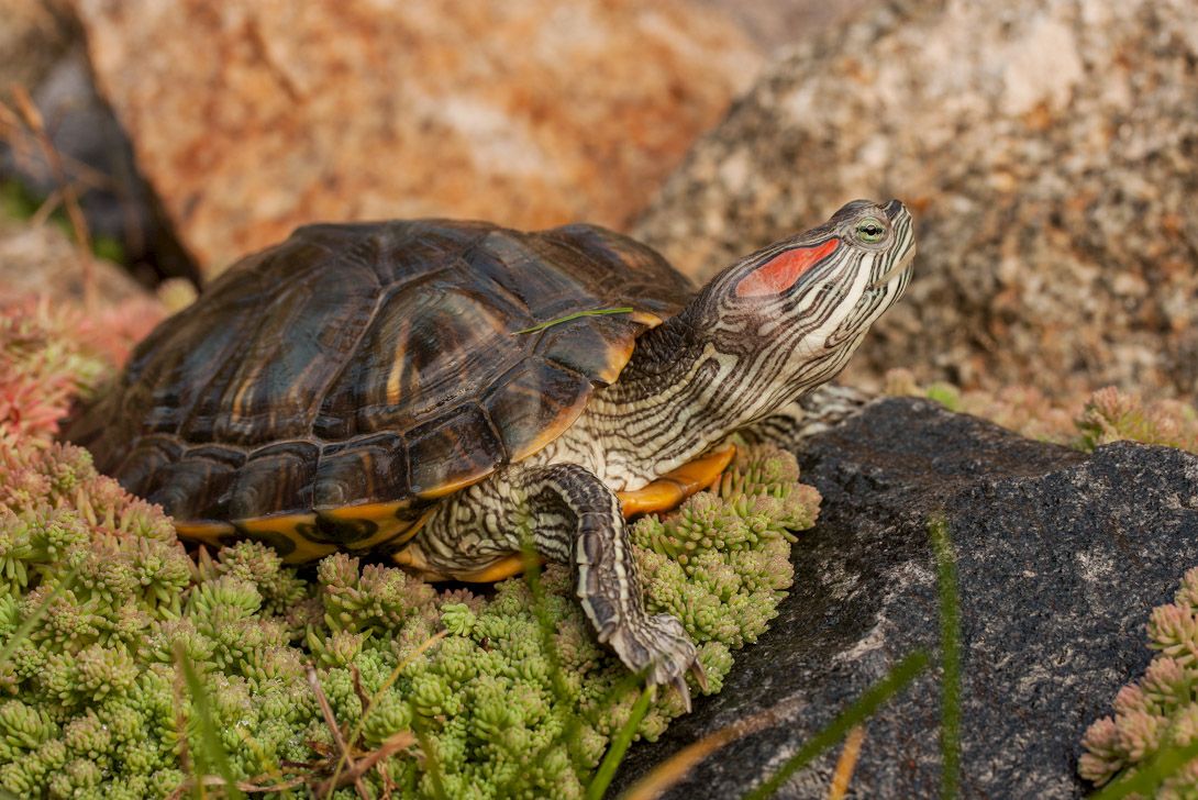 Красноухая черепаха или Желтобрюхая (лат. Trachemys scripta) — вид черепах из семейства американских пресноводных черепах. Черепаха средних размеров. Длина карапакса от 18 до 30 см в зависимости от пола черепахи и подвида. Самцы заметно мельче самок. На голове, шее и конечностях черепаха украшена рисунком из белых и зелёных волнистых полос и пятен. Своё название черепаха получила из-за двух удлинённых ярко-красных пятен рядом с глазами. Ареал обитания Красноухой черепахи охватывает США от юга Виргинии до севера Флориды и Канзаса, Оклахомы и Нью-Мексико на западе, Мексику, всю Центральную Америку, северо-запад Южной Америки (север Колумбии и Венесуэлы). Вид интродуцирован на юг Флориды, Аризону, Гваделупу, Израиль, некоторые страны Европы (в частности, в Испанию,Великобританию) и ЮАР. Проникла в Австралию, где официально признана вредителем, вытесняющим местную эндемическую рептофауну. В наших широтах не обитает, но является довольно распространенной у любителей аквариумной экзотики. Например эта модель была снята на очередной прогулке, после прибывания в аквариуме.