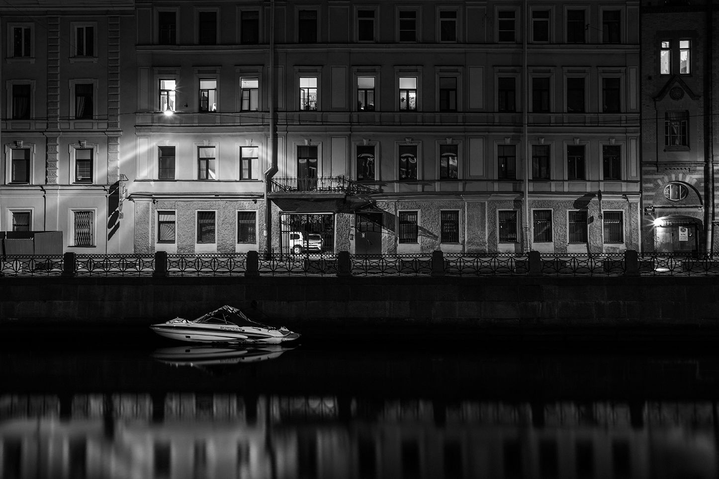 санкт-петербург, город, ночь, черно-белое, лодка, река, здание, Рыжков Роман
