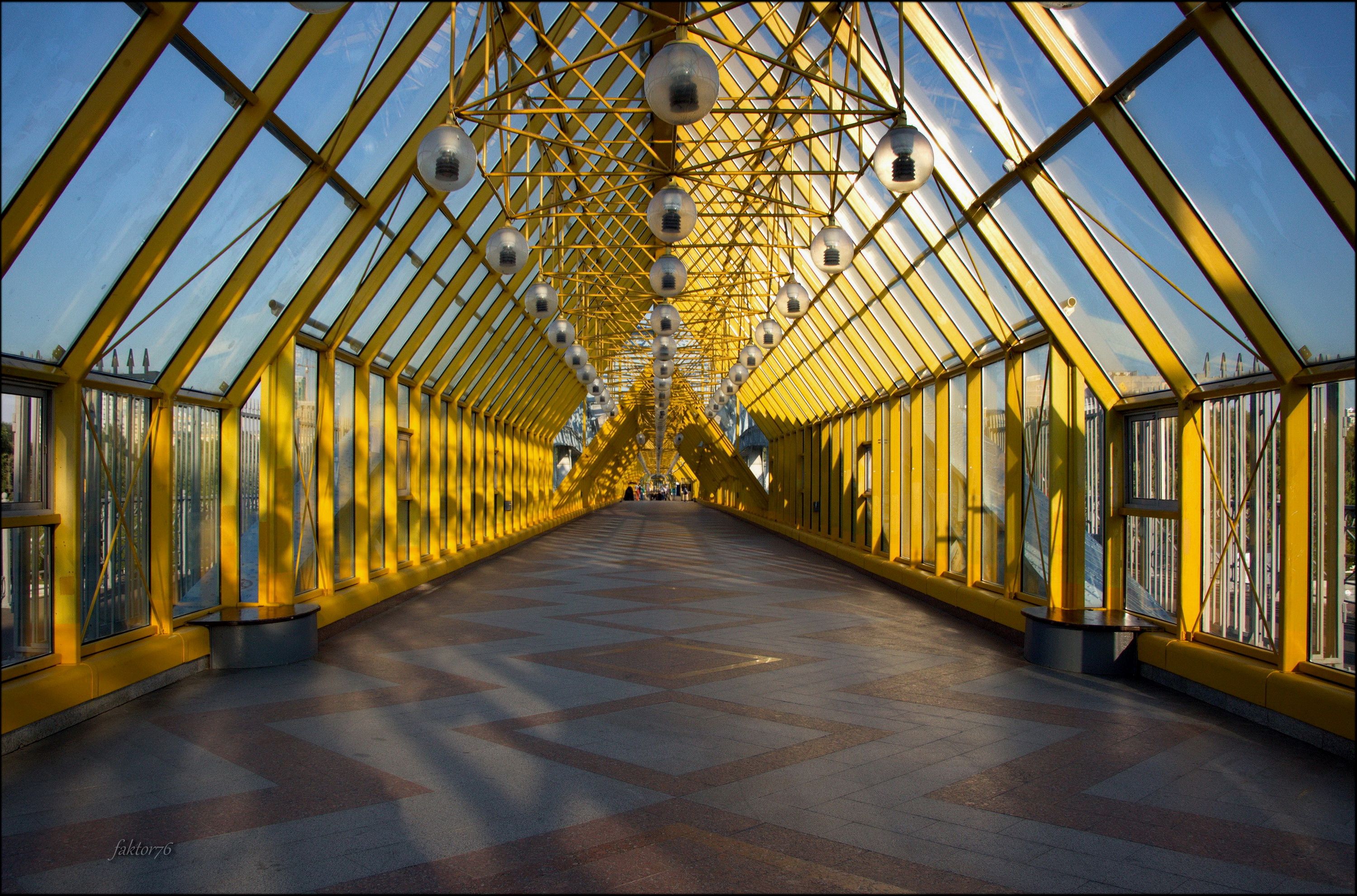 Главная арка пешеходного моста массой около 1500 тонн была перемещена на нынешнее место тремя баржами в 1999 году. Весь комплекс работ занял 11 месяцев, судоходство по реке было перекрыто на восемь с половиной суток, а собственно буксировка проводилась 22 мая 1999 года и заняла полтора часа. Так как русло реки на новом месте шире, чем в Лужниках, то со стороны Фрунзенской набережной арка опирается не на шарнир береговой опоры, а на выносную русловую опору; между шарниром арки и берегом — два железобетонных балочных пролёта по 25 м, декорированные фальшсводами. Опоры стоят на ростверках, под ними — буронабивные столбы и сваи глубиной до 17 м.