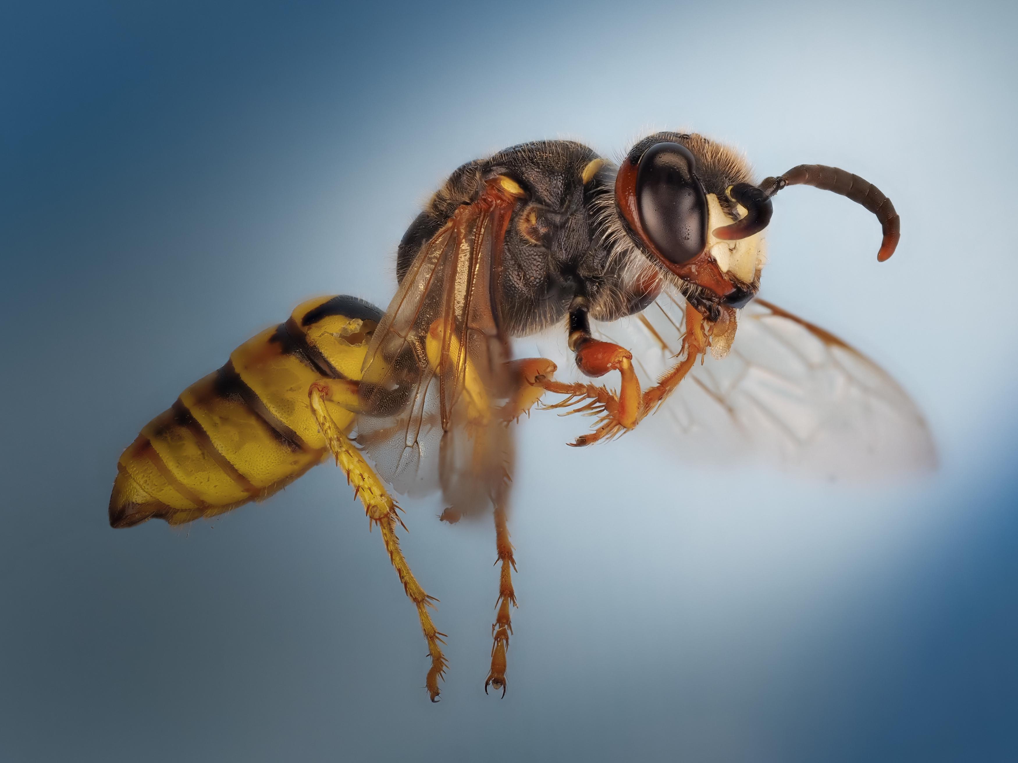 Это монстр.. Пчёл ест Шершень обыкновенный[Длина матки варьируется от 25 до 35 миллиметров, рабочие особи и самцы меньше. Самцы и самки немного различаются по строению: у самцов 13 сегментов усиков, у самок — 12, так же, как и у других ос. Брюшко самца имеет 7 видимых сегментов, брюшко самки на 1 сегмент меньше. Рабочие особи и матка имеют жало — видоизменённый яйцеклад, которое используется как защита от врагов. Шершень имеет глубокий изрез глаз, которые напоминают букву С. Глаза имеют красновато-оранжевый цвет. Брюшко имеет чередующиеся полосы оранжевого и чёрного цветов. Очень похож на дальневосточного сходного шершня Vespa simillima, от которого отличается крупной и грубой пунктировкой наличника. Дальневосточные экземпляры обыкновенного шершня всегда с красноватыми лопастями переднеспинки, тогда как у сходного шершня Vespa simillima переднеспинка сверху тёмная, одноцветная (красные пятна могут проявляться только на заднеспинке). Одноцветная тёмная спинка бывает только у сибирских экземпляров обыкновенного шершня, тогда как сходный шершень Vespa simillima в Сибири пока не обнаружен.